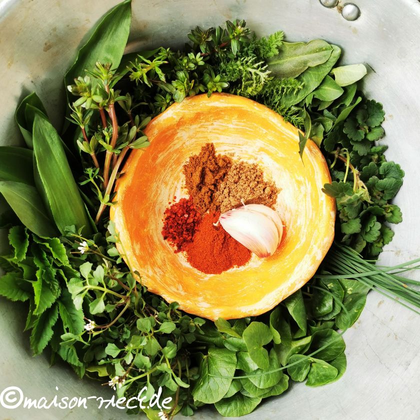 Grüne Soße ist ein Muss am Gründonnerstag, denn sie bringt den Frühling in Form aromatischer, gesunder frischer Kräuter auf den Teller. Neben der Frankfurter Grünen Soße gibt es unendlich viele Variationsmöglichkeiten, jede regionale Küche hat ihre eigene Version, die auf den jeweils dort heimischen Kräutern basiert. Eine klassische marokkanische Chermoula besteht aus überwiegend Koriandergrün, bei dem sich bekanntlich die Geister scheiden. Den Spirit der Chermoula kann man aber auch in einer Variante schmecken, die aus Wildkräutern zubereitet ist. Und das Beste daran: man muss sich für die Zutaten noch nicht einmal in einen Supermarkt begeben, sondern kann sie im Garten und auf der Wiese sammeln.
