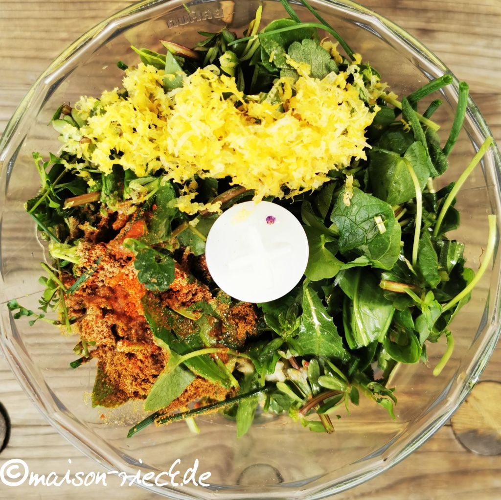 Die Kräuter waschen, trockenschütteln und grob hacken. In einen Pürierbecher oder einen Blender geben, die Gewürze und das Olivenöl dazu geben. Die Zitrone auspressen und die Hälfte der Zitronenschale abreiben. Zitronensaft und -abrieb zu den Kräutern geben. Alle Zutaten zu einer nicht zu flüssigen Soße pürieren. Am Schluss mit Salz abschmecken, ggf. noch Olivenöl zugeben.