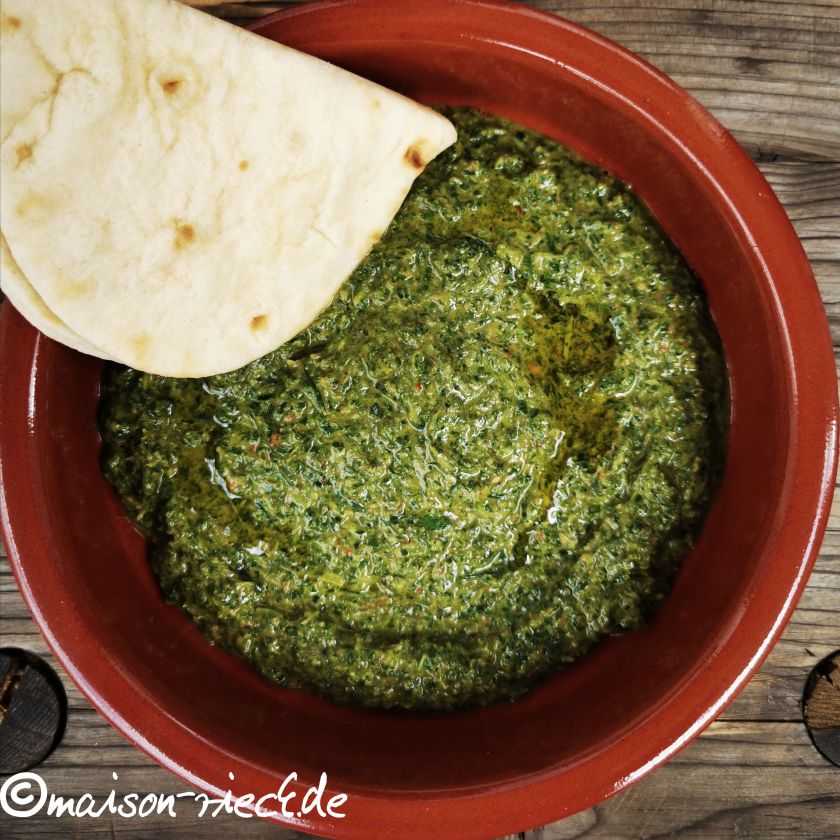 Die heimischen Wildkräuter, die in diesem Rezept das Koriandergrün ersetzen, können nach Belieben variiert werden. Entscheidend ist, was zu finden ist. Dabei sollte es aber immer eine Mischung mehrerer Kräuter sein, damit keines zu dominant ist. Die Menge der Kräuter für das nachfolgende Rezept sollte mindestens einem dicken Bund Petersilie entsprechen. Hat man viel Bärlauch zur Verfügung, kann man den Knoblauch reduzieren oder ganz weglassen. Kommt viel Schaumkraut oder ausdauernde Kresse in die Soße, braucht man weniger Chili-Schärfe. Ein größerer Anteil Sauerampfer ersetzt die Säure des Zitronensafts.