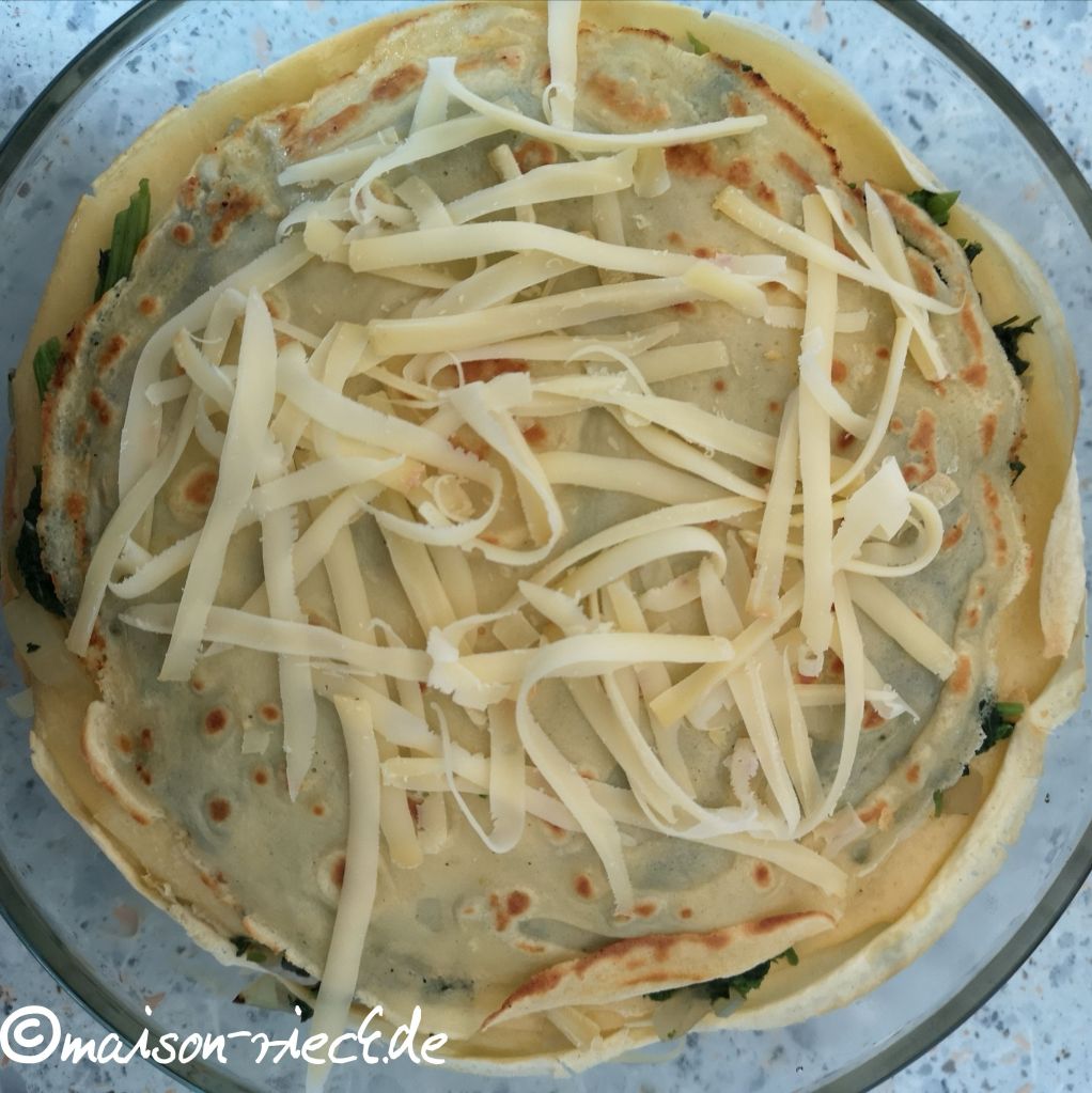 In einer kleinen Pfanne (ca. 22 cm Durchmesser) etwas Butter erhitzen und nacheinander 8 dünne Pfannkuchen aus dem Teig backen. Wenn alle Pfannkuchen fertig sind, einen Pfannkuchen in eine runde Auflaufform legen. Einen Teil des Brennnesselgemüses auf dem Pfannkuchen verteilen und ca. 1/8 des geriebenen Käses darüber streuen. Dann den nächsten Pfannkuchen darauf legen, ein wenig fest drücken und ebenso weiter verfahren, bis alle Pfannkuchen und das Gemüse aufgebraucht sind. Auf den obersten Pfannkuchen nur Käse streuen.