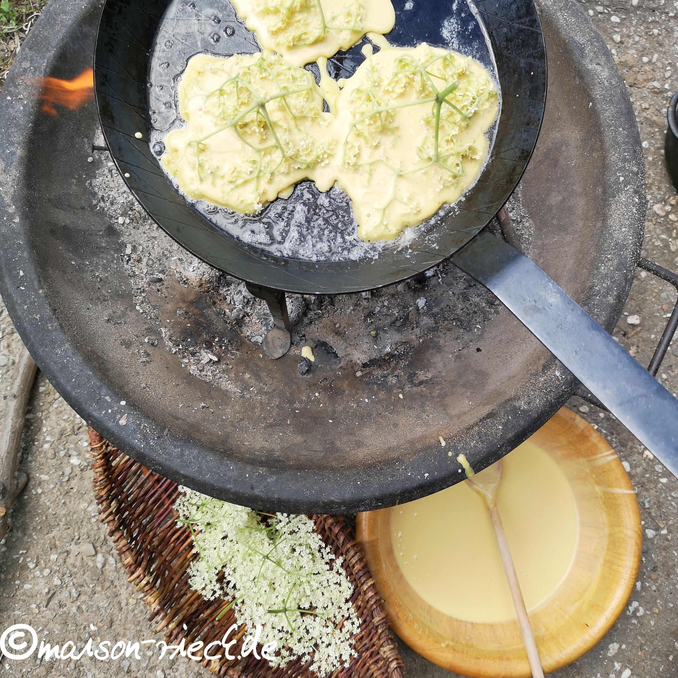 Das Rezept eignet sich prima, um aus frisch gesammelten Holunderblüten-Dolden die Küchle ganz frisch über dem Lagerfeuer zu backen.