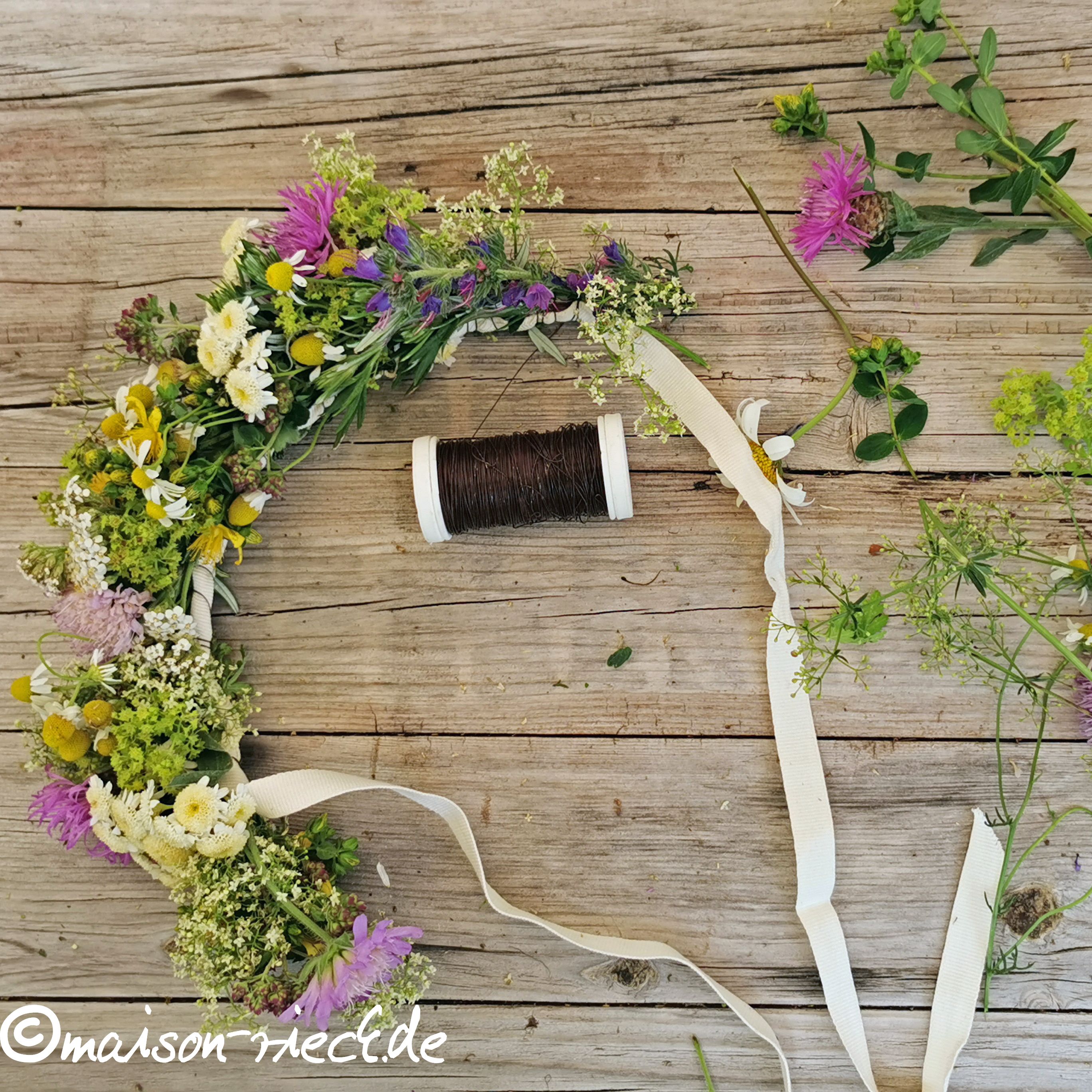 Zuerst werden die Wildblumen geteilt, so dass viele kleine Abschnitte mit Blüten entstehen (siehe Bild). Dann wird aus mehreren Blüten ein kleines Sträußchen zusammengestellt, das mit dem Floristen-Draht einmal umwickelt und damit fixiert wird. Dieses Sträußchen wird dann auf das Baumwoll- oder Satinband gebunden. Dabei bleiben etwa 20 cm des Bandes frei (dieses wird später zum Zusammenbinden und Anpassen am Kopf benötigt).