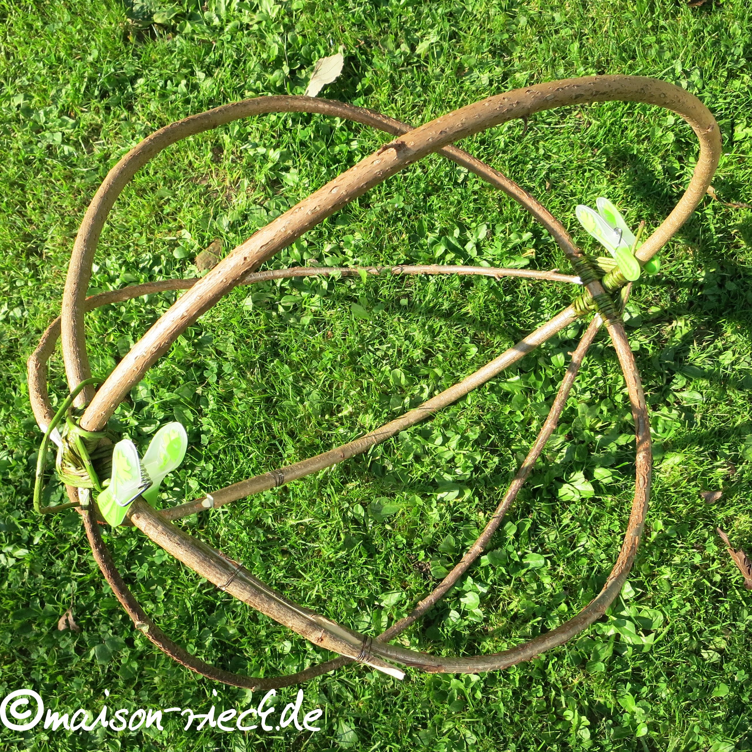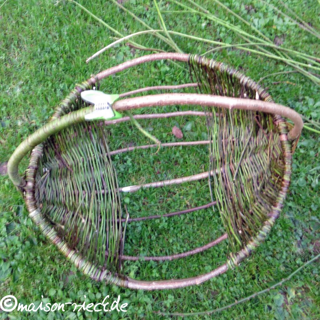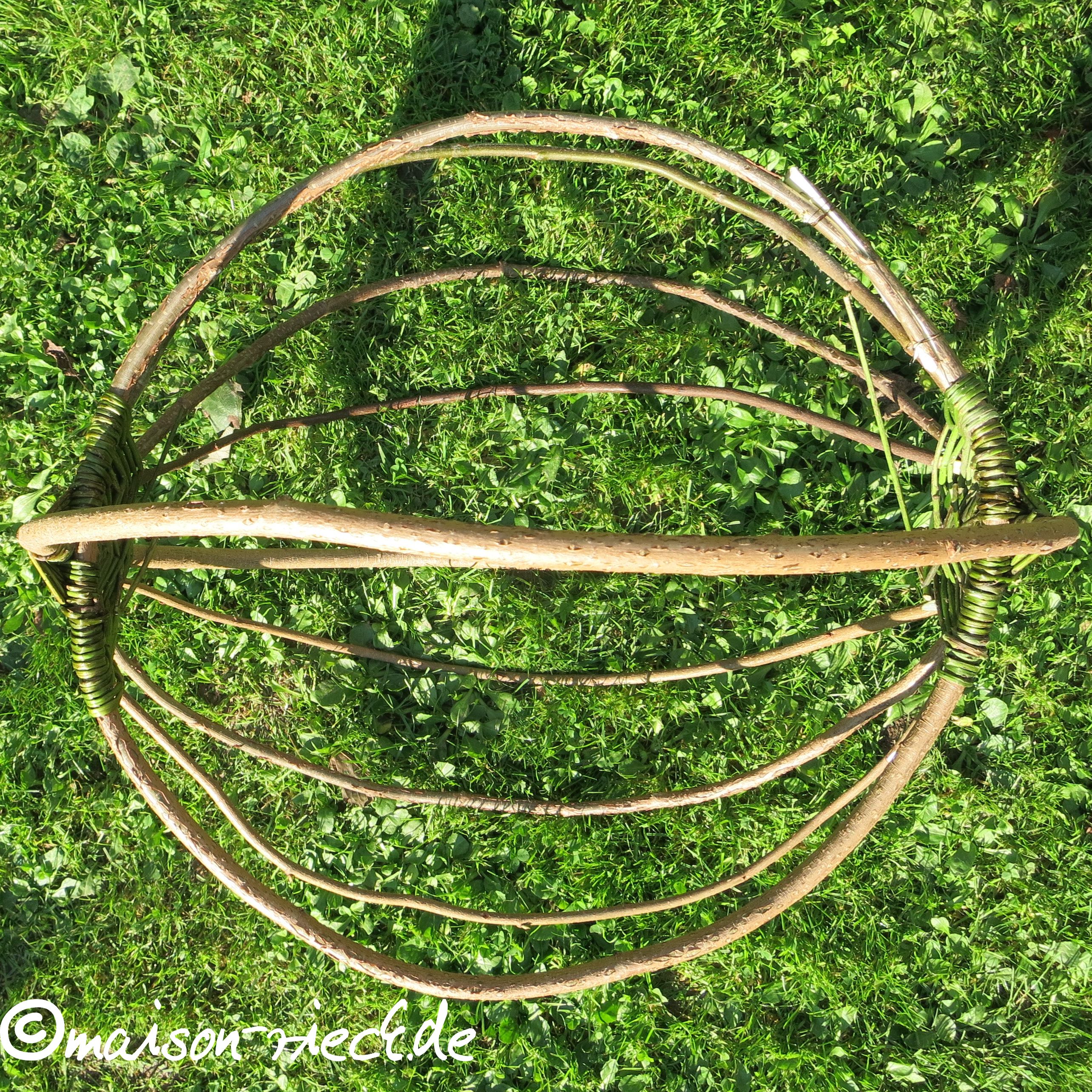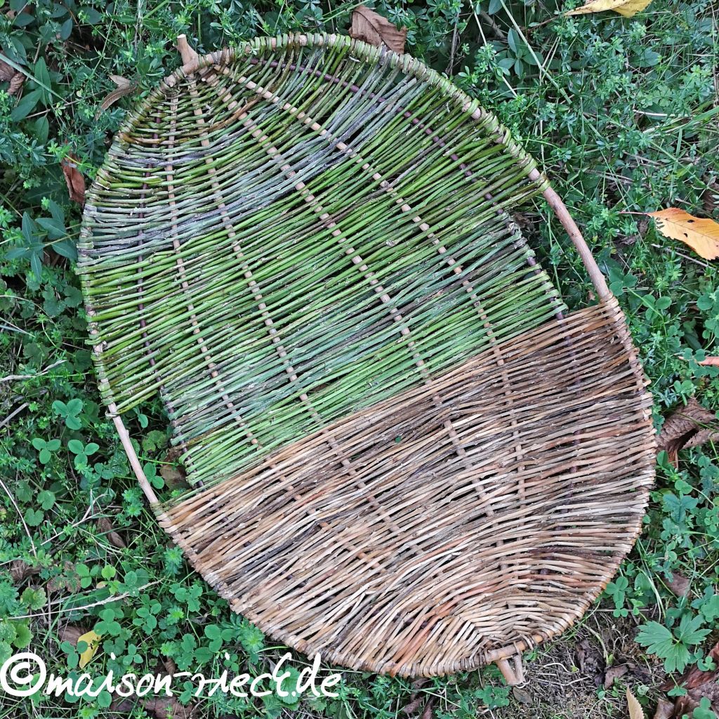 Wichtiger Hinweis: je frischer die Ranken verarbeitet werden, desto mehr schrumpfen sie beim Trocknen. Dadurch kann das Geflecht etwas lockerer werden. Das lässt sich ausgleichen, indem zu einem späteren Zeitpunkt in der Mitte noch weitere Ranken eingeflochten werden.