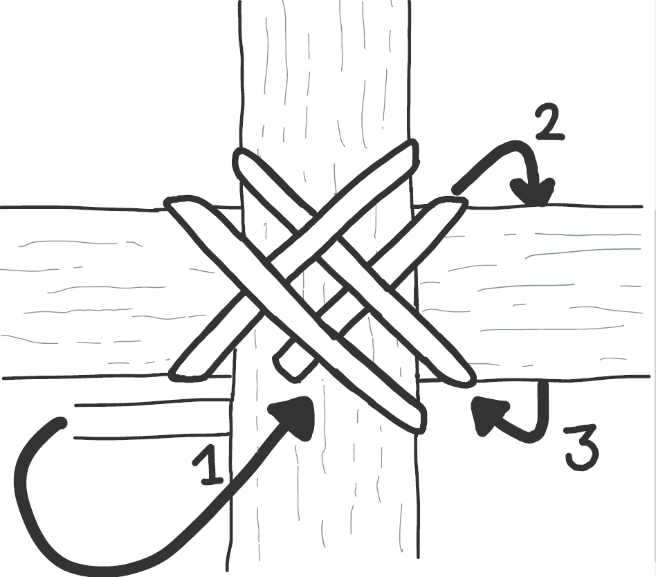 In die untere Hälfte werden nun zwei der kürzeren Äste eingebaut, indem man sie anspitzt und in die Ecken zwischen der ursprünglichen Kreuzung der beiden Reifen und dem Auge Gottes steckt. Die Länge der beiden Äste (Streben) muss so angepasst werden, dass sie sich biegen und die spätere Form des Korbes vorgeben.