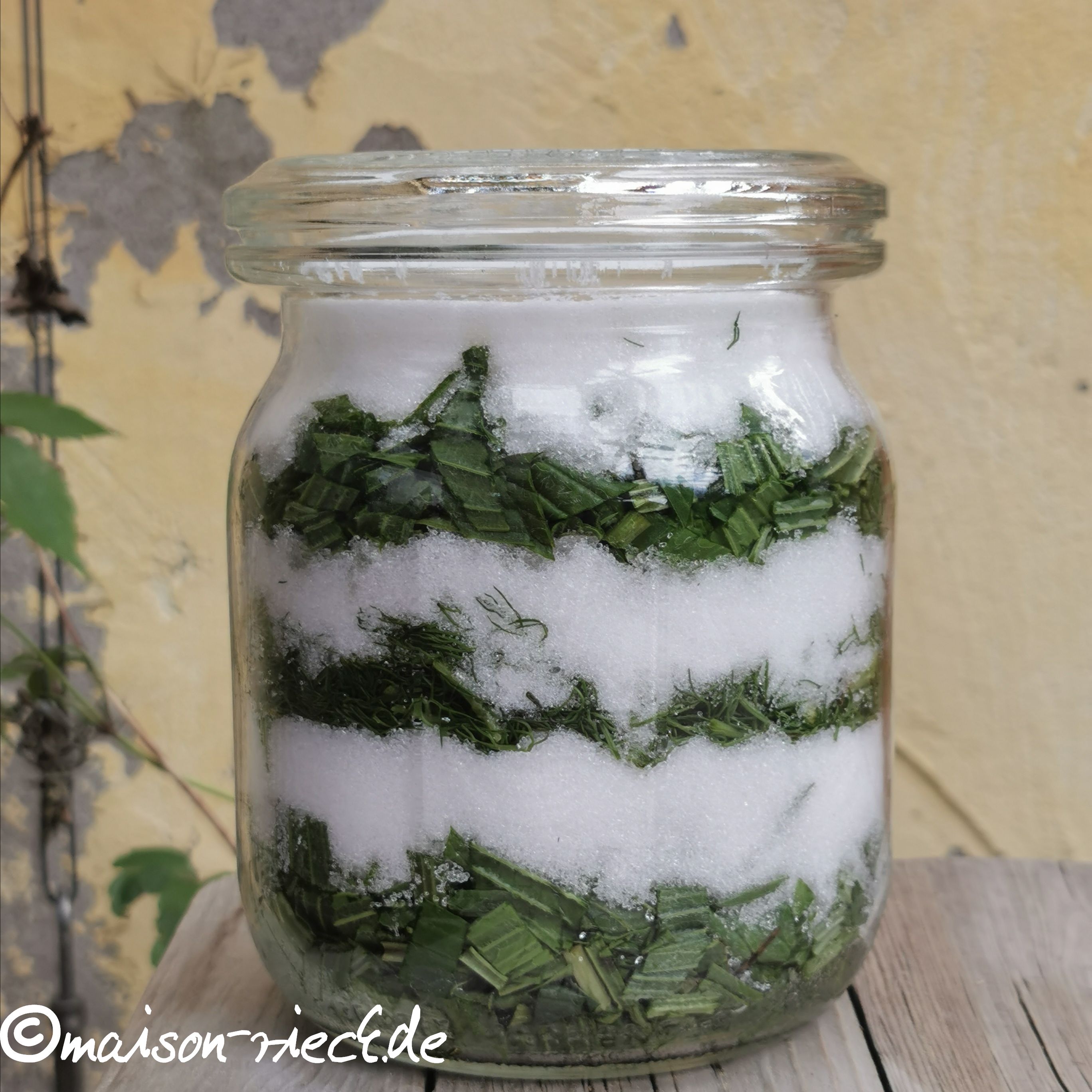 Ein sauberes Einmachglas in passender Größe schichtweise mit den kleingeschnittenen Kräutern und dem Zucker bzw. Honig füllen.