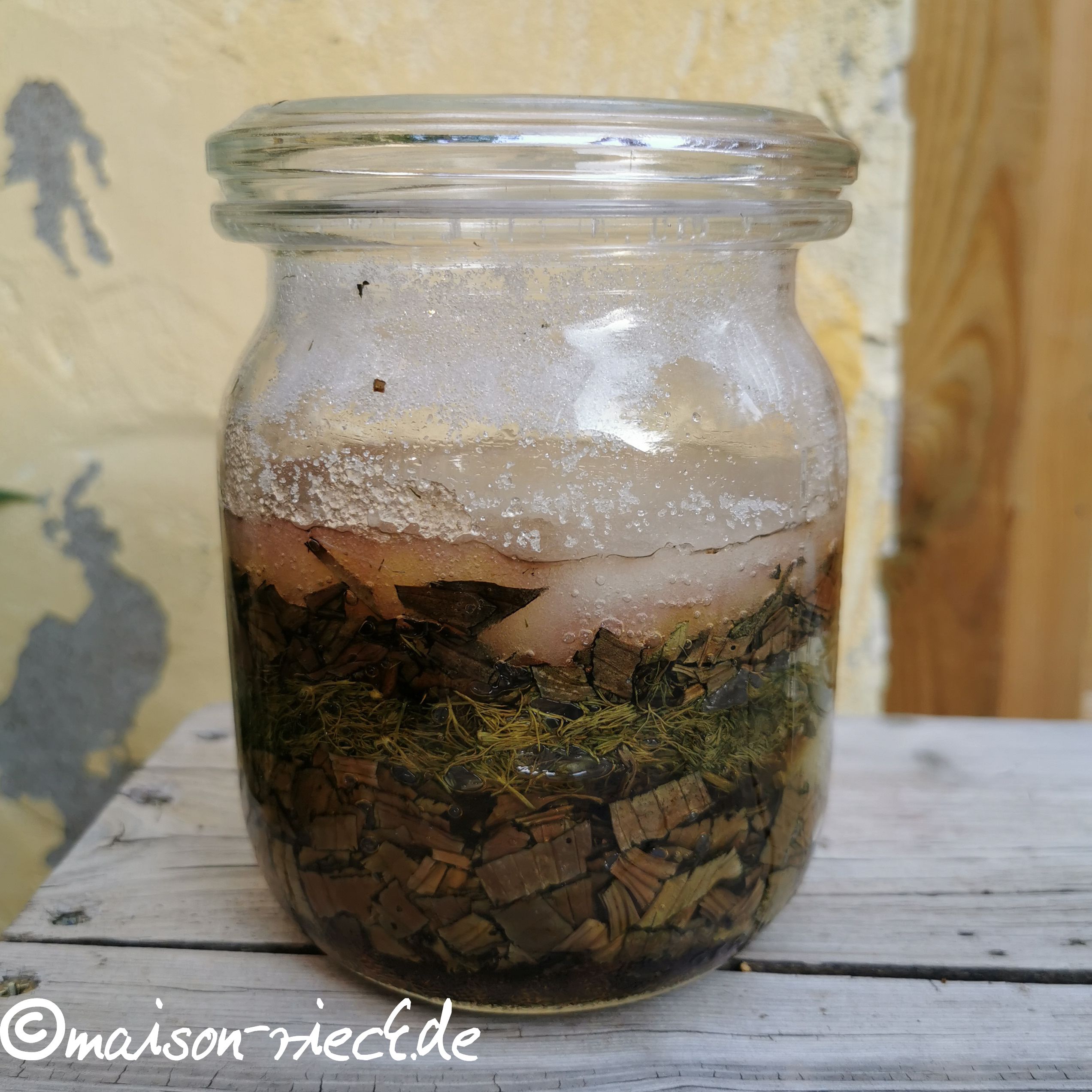 Nach ca. 3 Monaten bzw. Vollmonden den Kräuter-Zucker-Kaltauszug wieder ausgraben. Die Mischung durch ein feines Sieb laufen lassen und den gefilterten Sirup in kleine Flaschen oder Gläser abfüllen.