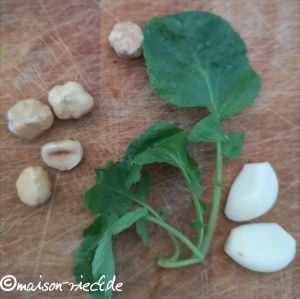Statt der obligatorischen Pinienkerne passen geröstete Haselnüsse hervorragend zu dem leicht scharfen Grünzeug. Ein oder zwei frische Knoblauchzehen, etwas Salz und ein gutes Olivenöl dazu – fertig ist ein frisches Pesto!