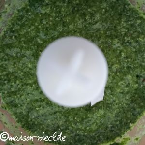 Alle Zutaten zusammen in einem Pürierbecher oder kleinen Küchenmixer zu einer Paste verarbeiten. Die Öl-Menge kann je nach Verwendung angepasst werden für eine flüssigere oder festere Konsistenz des Pestos. Für einen besonders frischen Geschmack ggf. noch 1 EL Zitronensaft dazugeben.