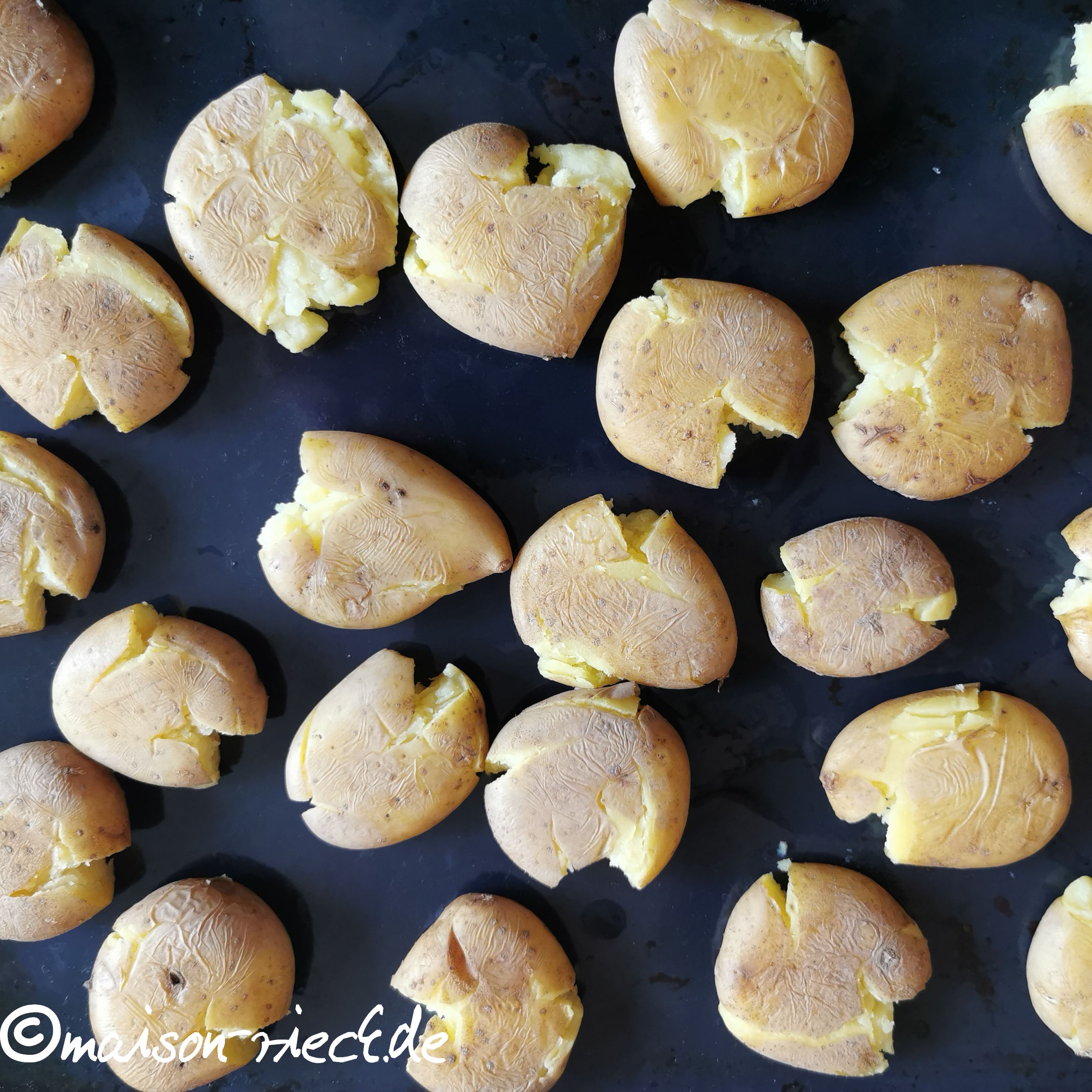 Sie stammen aus den USA, aber so richtig gut übersetzen lassen sich die „smashed potatoes“ nicht ins Deutsche, zumal „zerquetscht“ oder „zerschmettert“ auch keine besonders schöne Assoziation ist. Ich finde, die Bezeichnung „Kartoffel-Nuggets“ deutlich ansprechender und trifft es recht gut, vor allem wenn die Kartoffeln so schön goldgelb sind.
