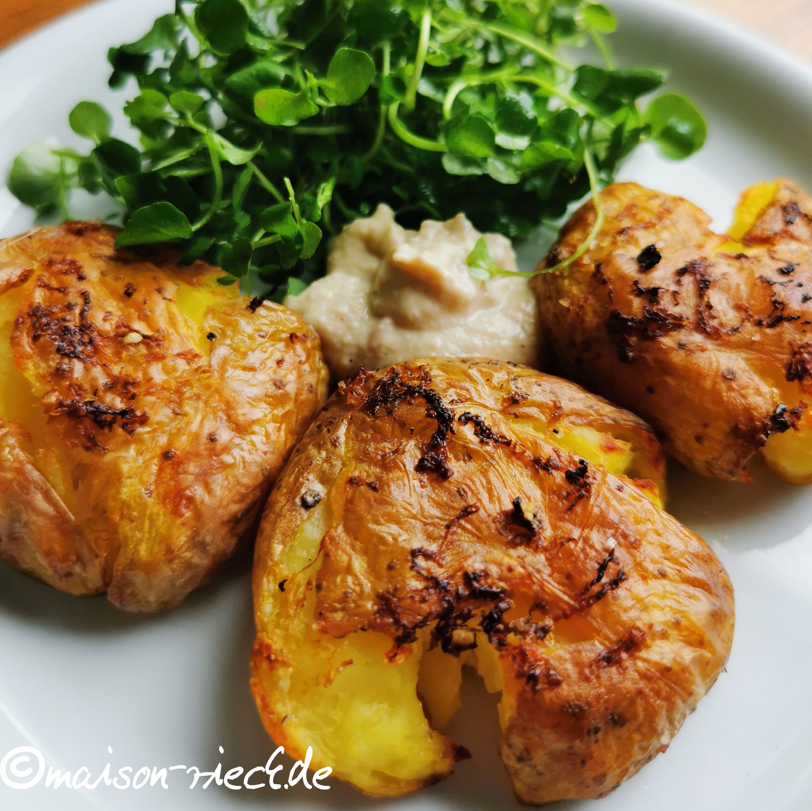Eine Kartoffelgericht-Variante, die bei uns noch nicht so bekannt ist, aber unbedingt bekannter zu werden verdient: „zerschmetterte“ Kartoffeln, mit Olivenöl und Kräutern überbacken und mit einem frischen Dip serviert.