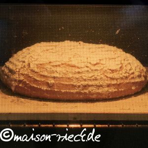 Die Brote auf den Backstein oder ein mit Backpapier ausgelegtes Backblech stürzen, ggf. mit einem scharfen Messer die Oberseite einritzen. Nach 10 min die Temperatur auf 185°C reduzieren und das Brot in ca. 1 Std. fertig backen. Das Brot ist fertig, wenn es sich hohl anhört, wenn man auf die Unterseite klopft.