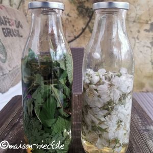 Um den Kräuter-Essig anzusetzen, ist eine weithalsige Flasche sehr praktisch. Man kann sie gut verschließen und kann die Pflanzenteile später auch leicht wieder daraus entfernen. Glas ist außerdem säureresistent, leicht zu reinigen und die Veränderungen in der Flasche lassen sich gut beobachten. Da der Deckel durch die Essigsäure angegriffen werden kann, wenn er nicht explizit für Säure geeignet ist, sollte man zwischen Deckel und Inhalt unbedingt ein Stück Frischhaltefolie oder Backpapier legen.