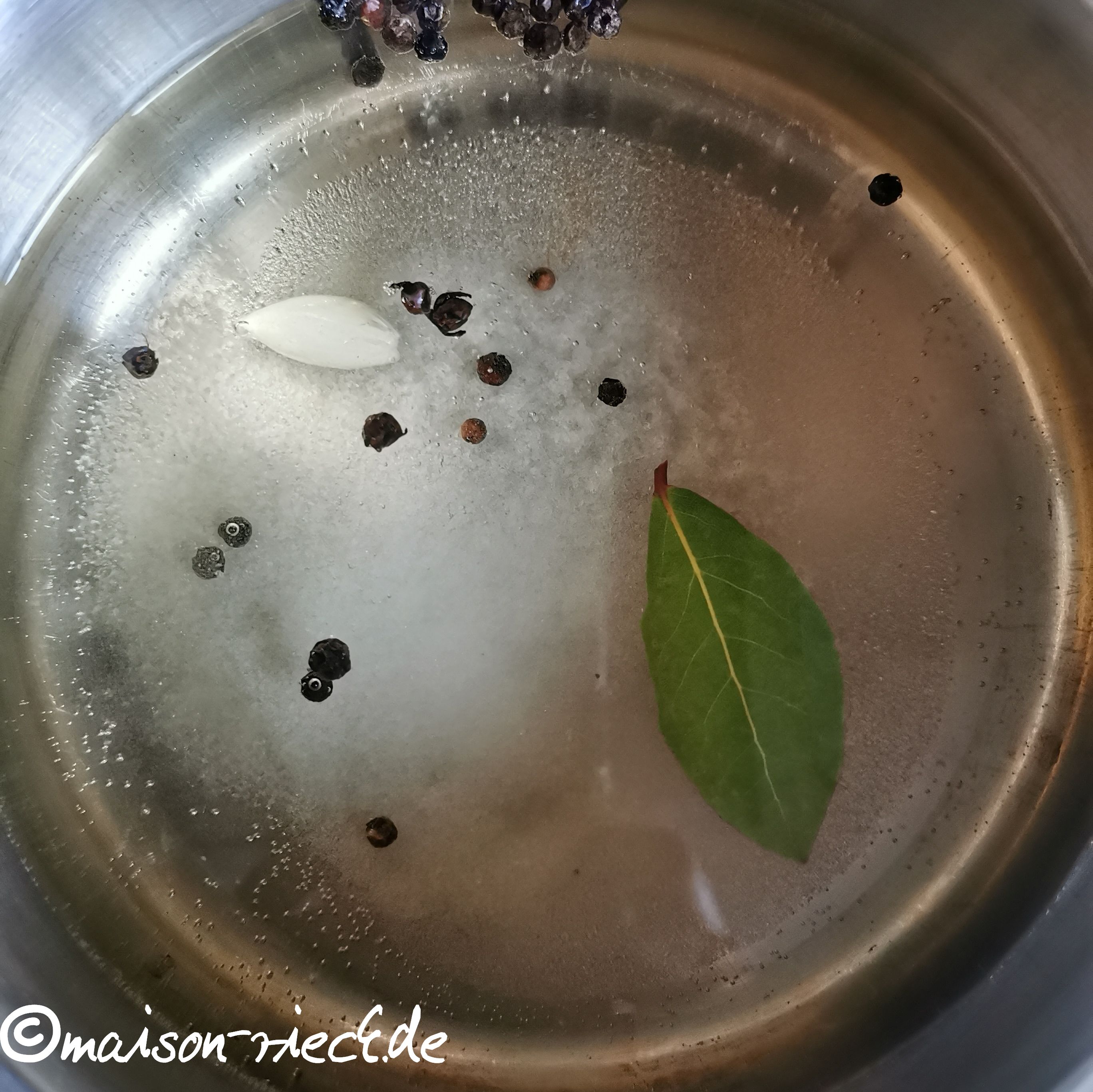 Wasser, Apfelessig, Salz, Zucker, Pfefferkörner und Lorbeerblatt in einen Topf geben und kurz aufkochen. Die Knoblauchzehen dazu geben, dann den Sud ca. 5 Minuten abkühlen lassen. Anschließend über die Knöterich-Ringe in das Glas gießen. Die Knöterich-Ringe müssen alle bedeckt sein, ansonsten ggf. noch mehr Sud aus verdünntem Apfelessig dazu geben.
