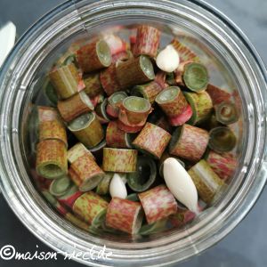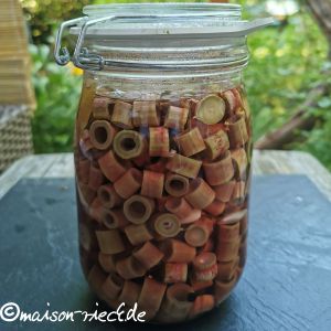 Die Staudenspitzen des Japanischen Knöterichs von den Blättern befreien. Dann die Stängel in Ringe schneiden und in ein 1-Liter-Drahtbügelglas geben.
