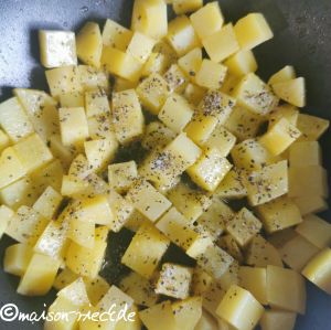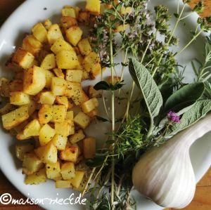 Die fertigen Kartoffelwürfel nochmal mit einer Prise des aromatischen Kräutersalzes abschmecken und mit Salat servieren.
