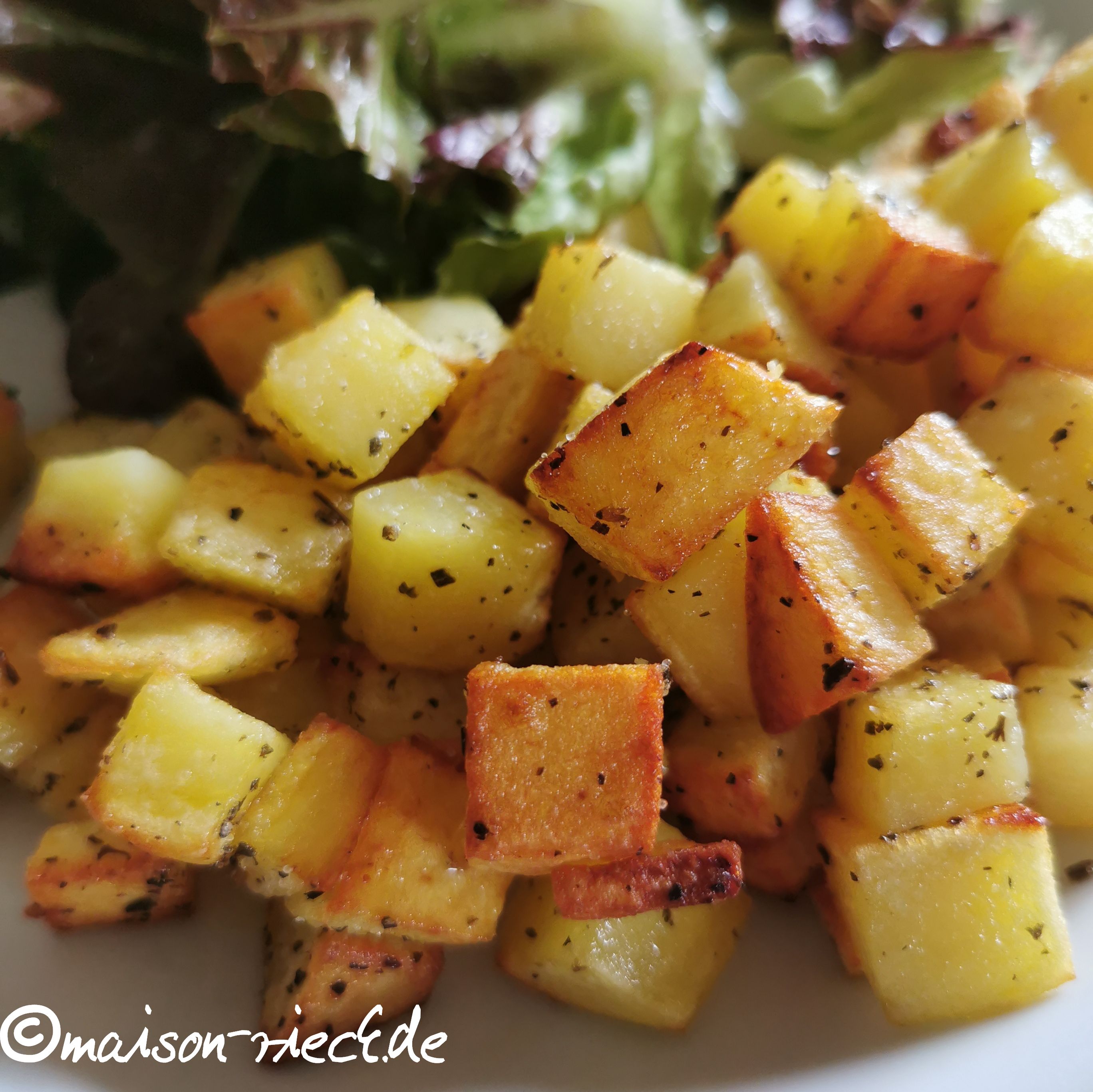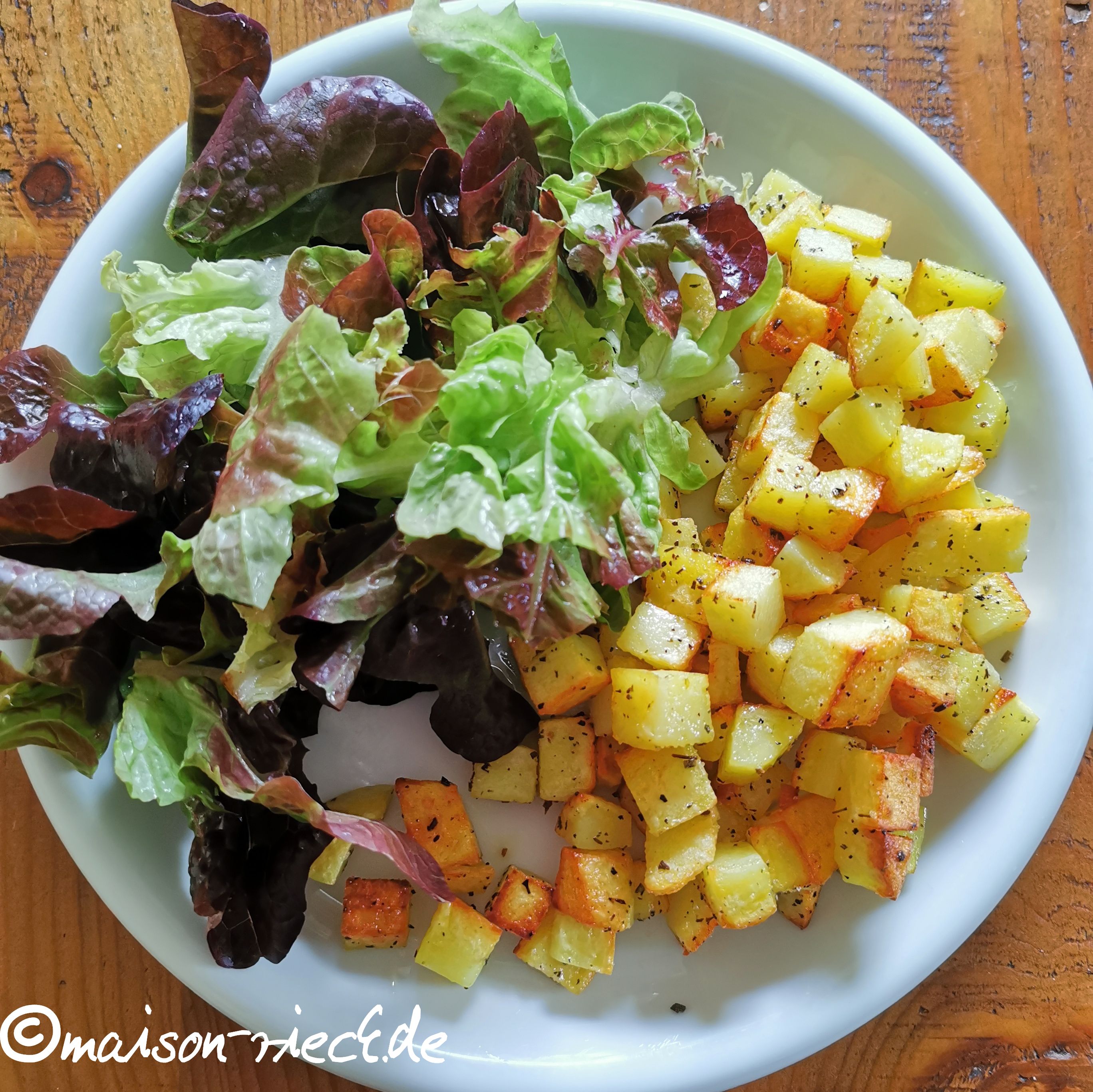 Die fertigen Kartoffelwürfel nochmal mit einer Prise des aromatischen Kräutersalzes abschmecken und mit Salat servieren.