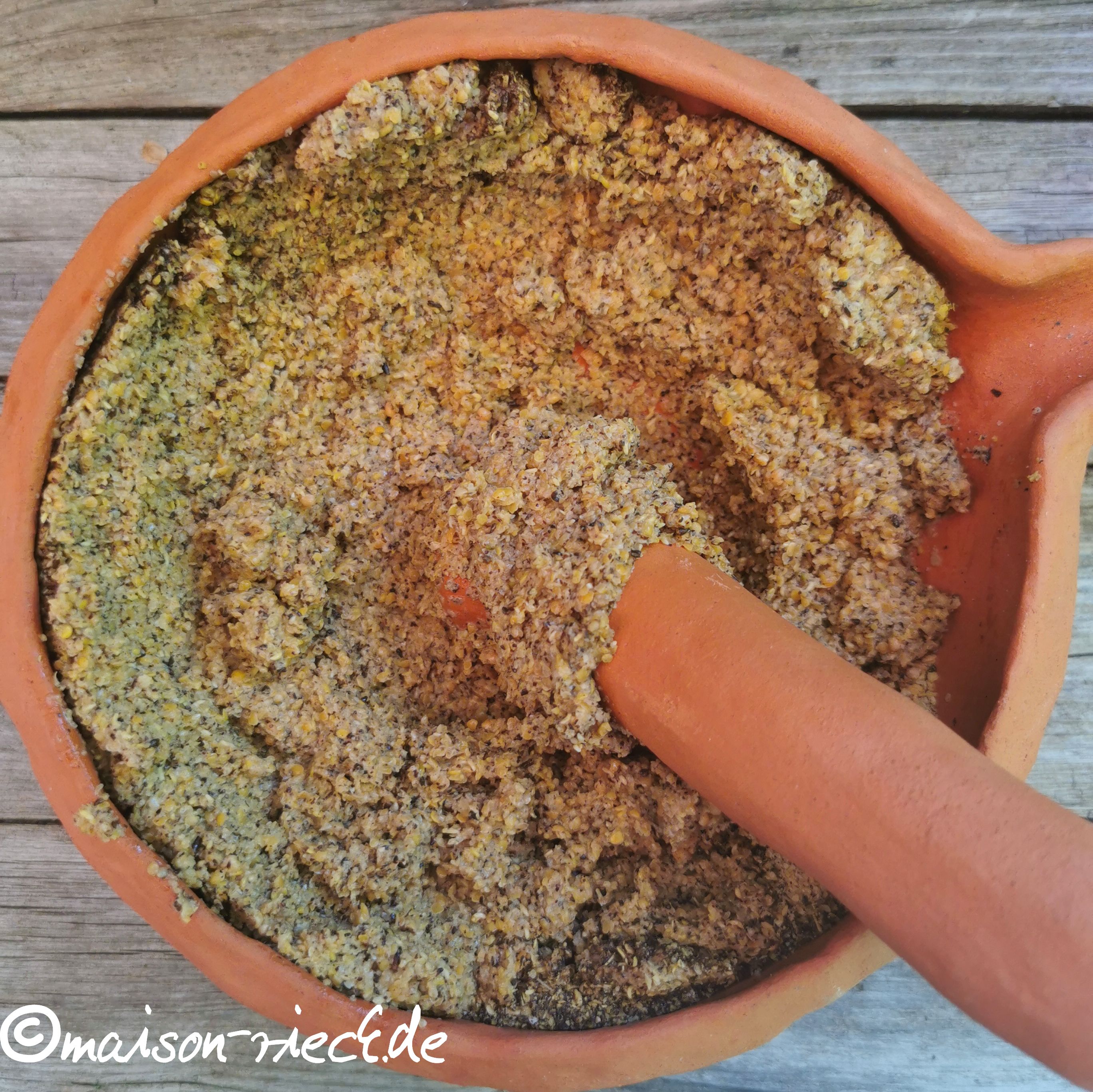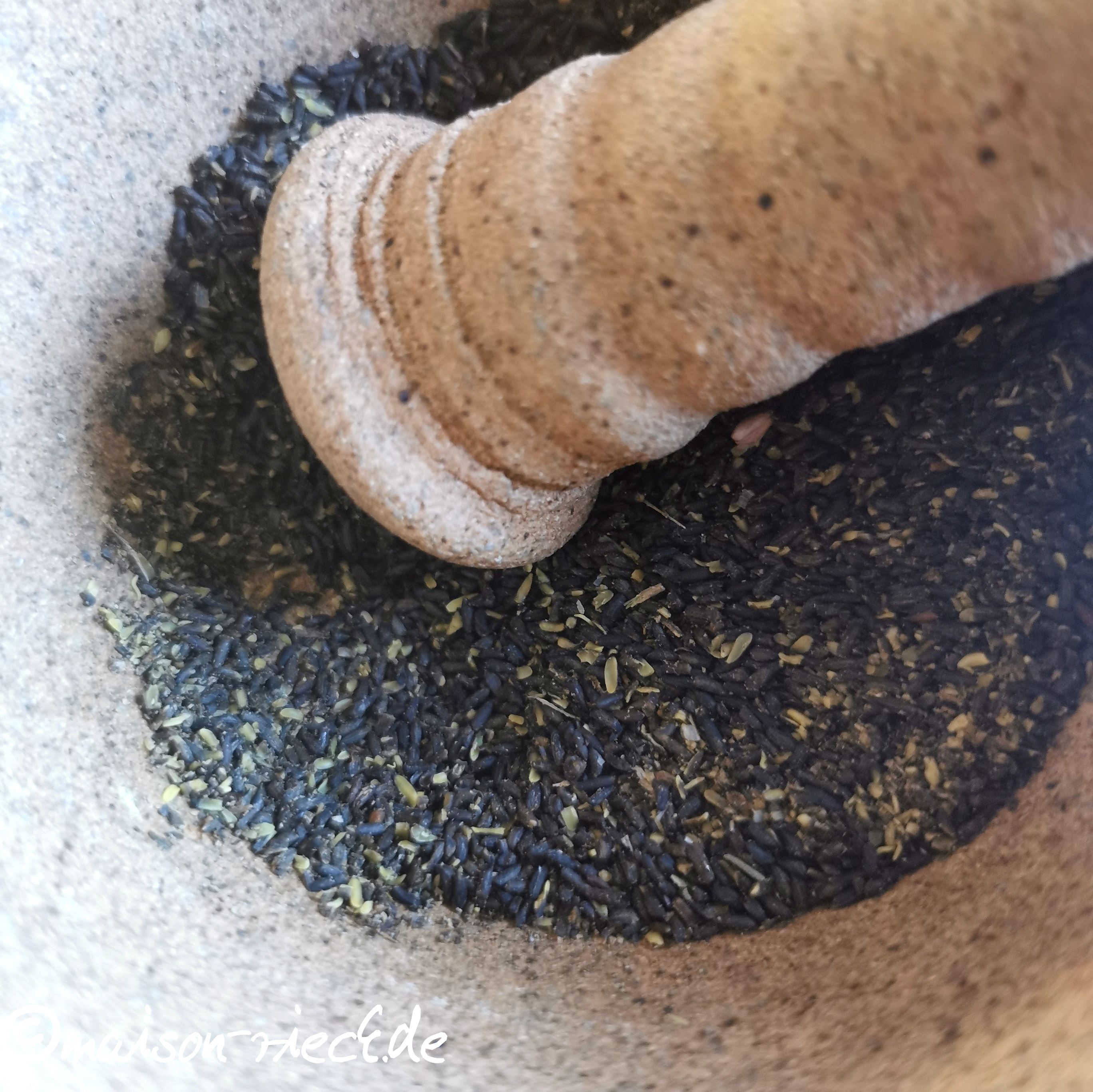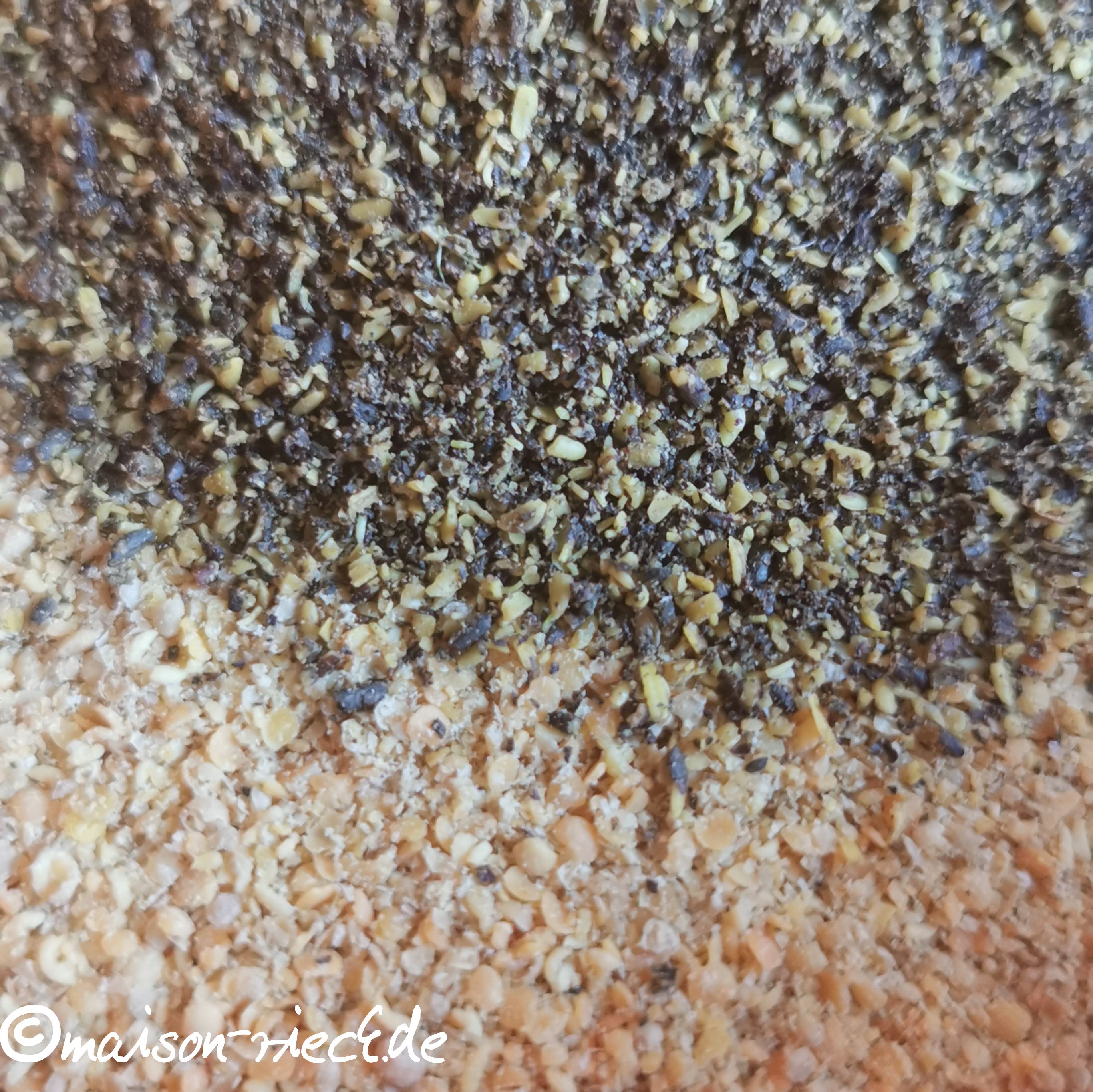 Zuerst müssen die Senfkörner und die Knoblauchrauke-Samen so fein wie möglich gemahlen werden. Traditionell wurde das in kleinen Mengen in einem Mörser gemacht, Senfmühlen verwenden dafür ähnliche Mahlsteine wie bei der Getreideverarbeitung. Wenn es schnell gehen soll, leistet eine elektrische Kaffeemühle oder ein Blitzhacker heutzutage gute Dienste.
