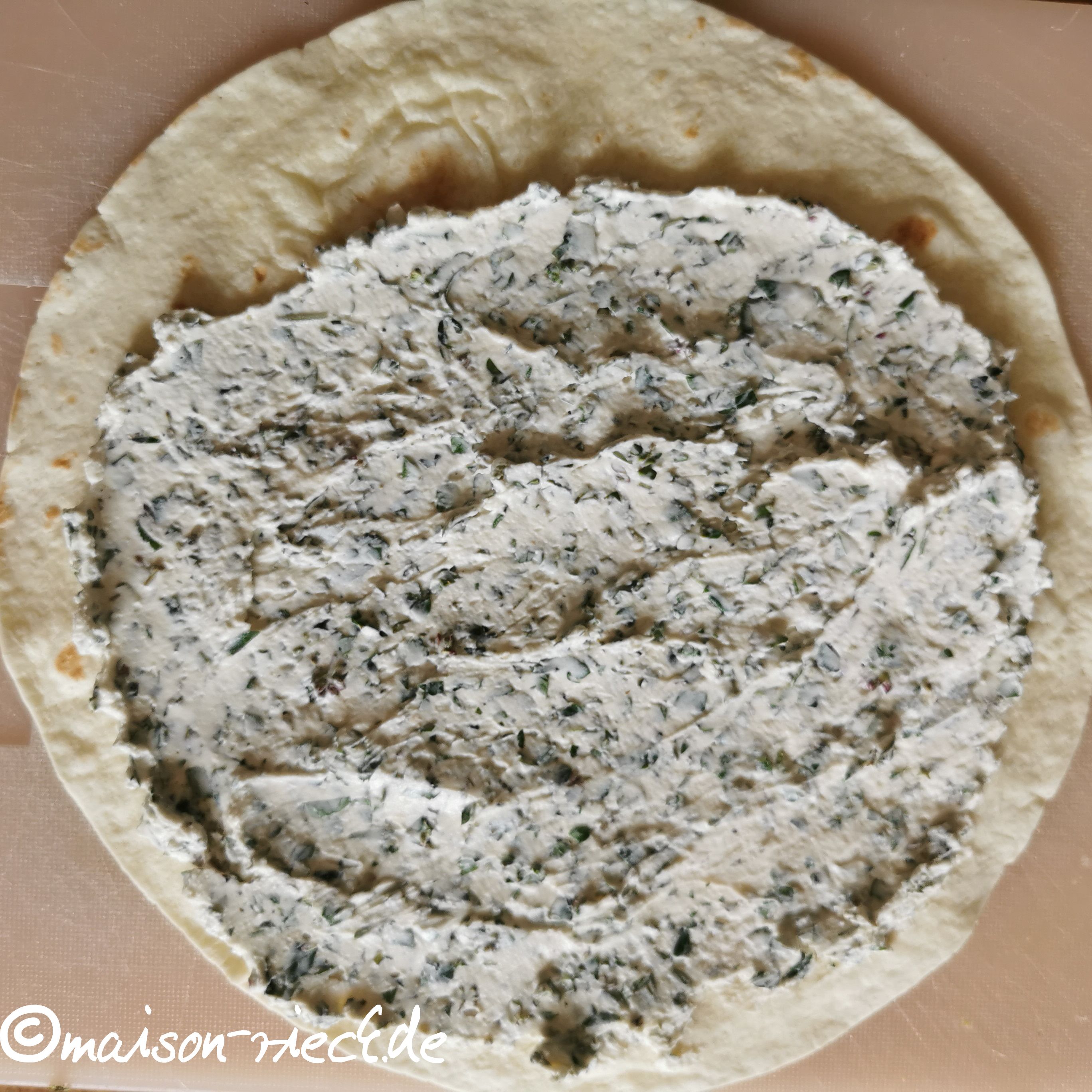Einen Tortilla-Fladen in einer Pfanne ohne Fett kurz erwärmen. Dann aus der Pfanne nehmen und den Fladen mit einem Sechstel der Frischkäse-Masse gleichmäßig bestreichen. Dabei den oberen Rand freilassen. Die Tortilla von unten aufrollen. Mit den übrigen Fladen ebenso verfahren. Die Rollen in der Mitte halbieren und die Wraps auf einem Teller anrichten.