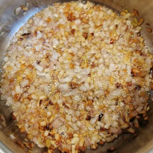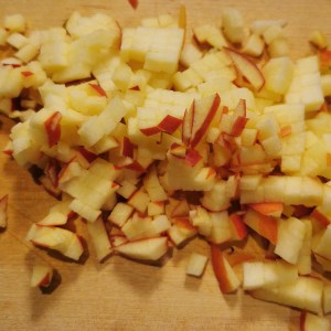Zwiebeln und Apfel (mit Schale) in sehr feine Würfel schneiden. 2 EL des Kokosöls in einem Topf erhitzen, die Zwiebelwürfel darin so lange andünsten, bis sie deutlich bräunen. Dann die Apfelwürfel und ½ TL Salz dazu geben und die Masse weiter dünsten, bis die Äpfel glasig werden und deutlich geschrumpft sind. Sie sollen allerdings nicht zu Mus verkochen.