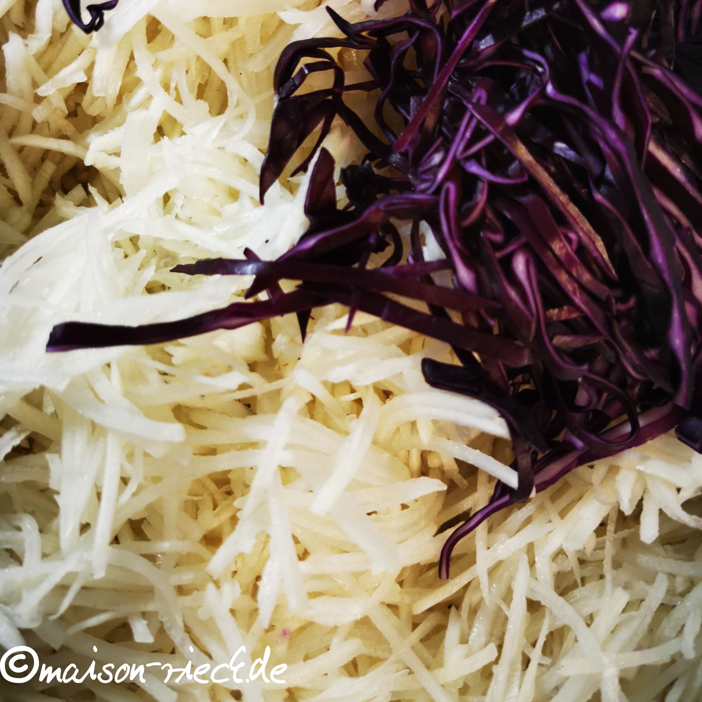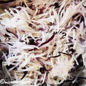 Den geschälten Schwarzen Rettich mit der Hand oder in einer Küchenmaschine in feine Streifen (Juliennes) schneiden. Das Rotkohl-Stück in sehr feine Streifen schneiden. Beides zusammen mit dem abgewogenen (!) Salz in eine Schüssel geben und gut durchmischen. Dann das gesalzene Gemüse mindestens eine Stunde lang stehen lassen. Wichtig: der Salzanteil muss immer 2 – 2,5% betragen. Falls mehr oder weniger Gemüse verwendet wird, die Salzmenge deshalb unbedingt anpassen!