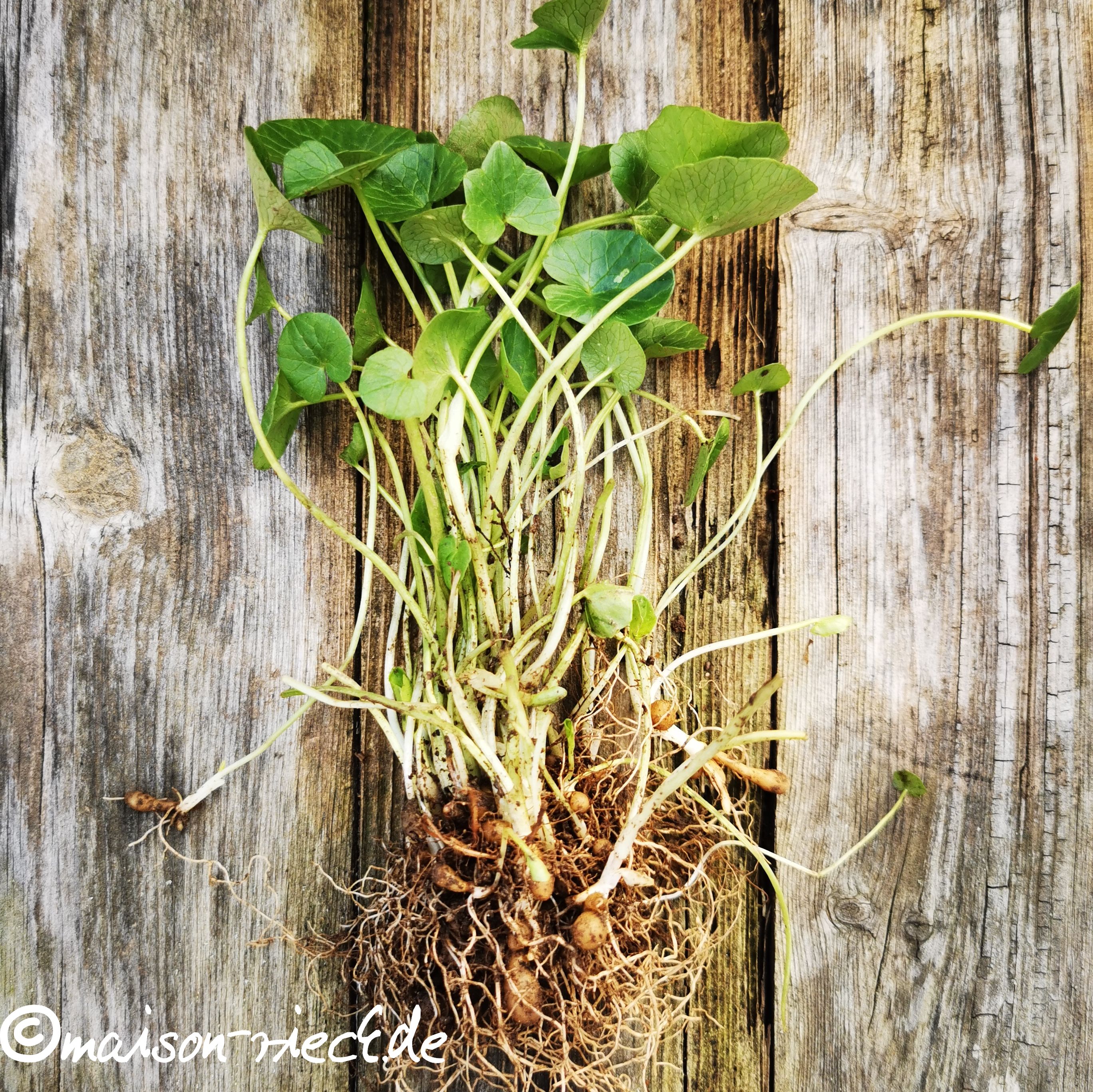 Das Grün der meisten Frühblüher wie Schneeglöckchen, Märzenbecher, Krokusse, Blaustern, Narzissen ist NICHT essbar, alle Pflanzenteile sind für Menschen giftig! Eine Ausnahme stellt das Scharbockskraut (Ranunculus ficaria) dar. Noch bevor die Bäume ihre Blätter entfalten, bedeckt es mit seinen grünen Polstern das karge Braun der Erde. Scharbock ist eine alte Bezeichnung für Skorbut, eine Vitaminmangelkrankheit. Früher wurde der Mangel an Vitaminen oft durch zu wenig frisches Gemüse und Obst verursacht. Durch die Südfrüchte, die bei uns das ganz Jahr über erhältlich sind, ist dieses Problem längst nicht mehr so akut. Trotzdem hängt die Versorgung mit Vitamin C und anderen wichtigen Vitaminen immer noch stark von der Ernährung ab. Außer durch frisches Obst und vitaminschonend zubereitetes Gemüse kann auch Sauerkraut und anderes fermentierte Gemüse zu einer guten Vitamin-C-Versorgung beitragen (siehe Rotes Sauerkraut, Fermentiere Möhren, Fermentierter Schwarzer Rettich).