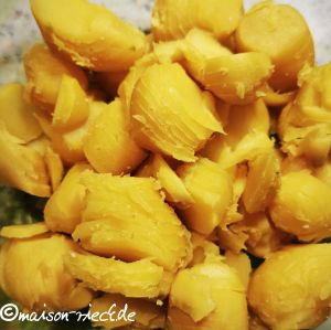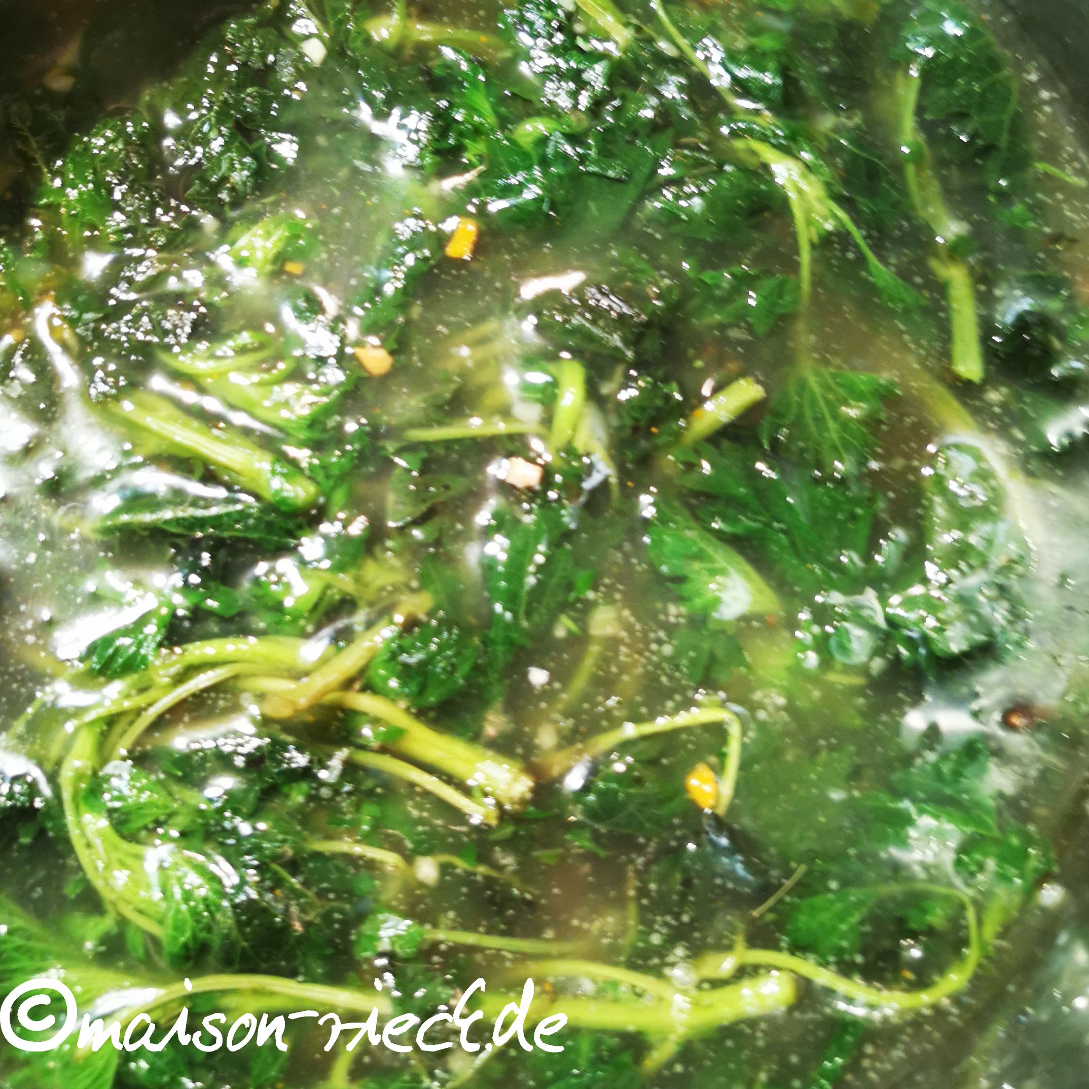 Um den Vitamin C-Gehalt der Pflanzen zu erhalten, sollten sie nur ganz kurz blanchiert (Brennnesseln) oder erst mit der leicht abgekühlten Kartoffelsalat-Marinade püriert werden.