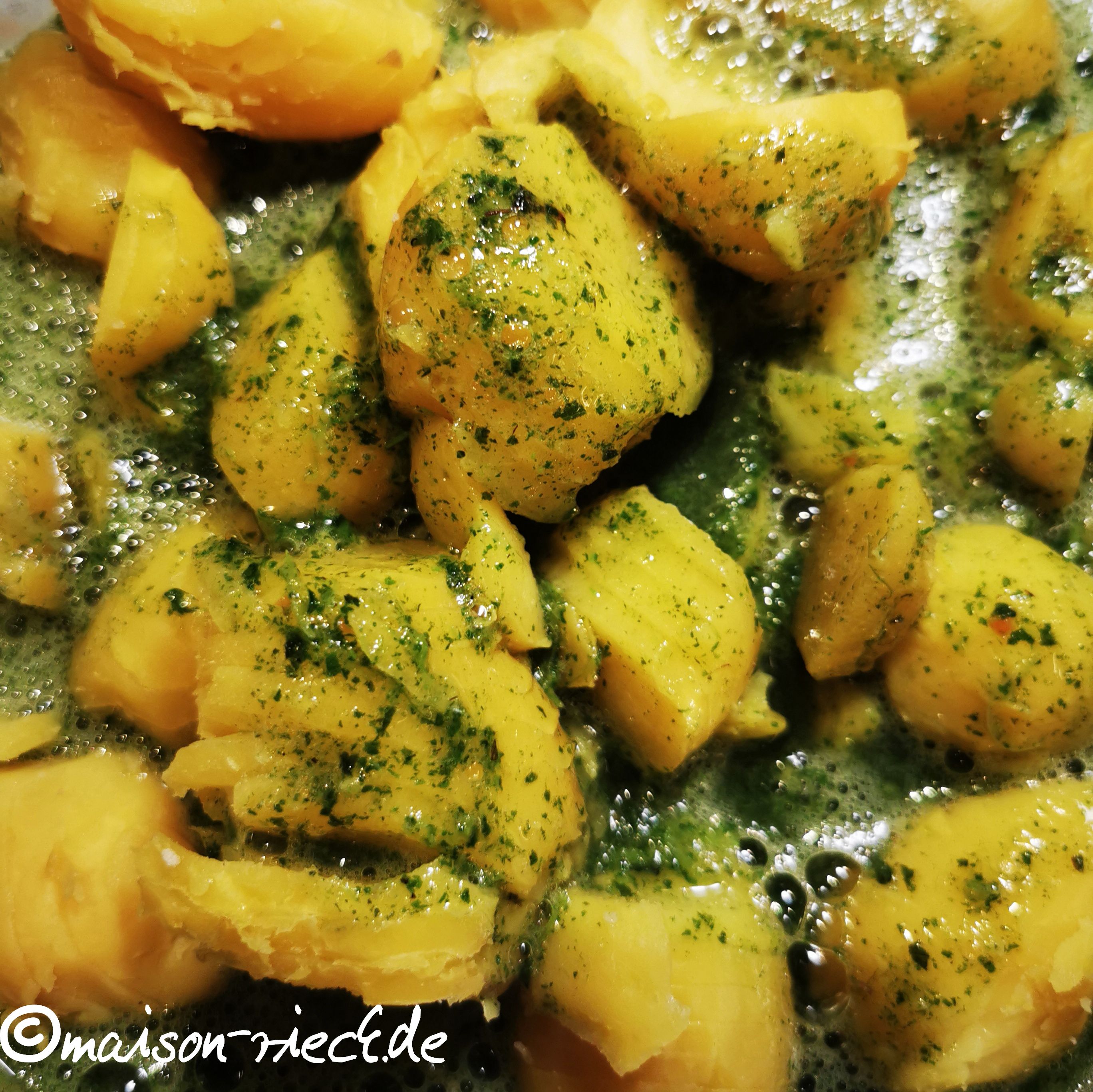 Anschließend die Marinade mit einem Pürierstab pürieren und sofort über die Kartoffeln geben und alles gut miteinander vermengen.
