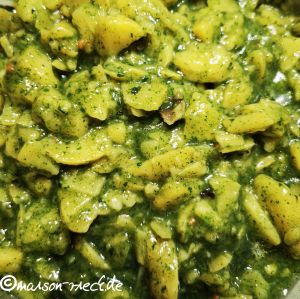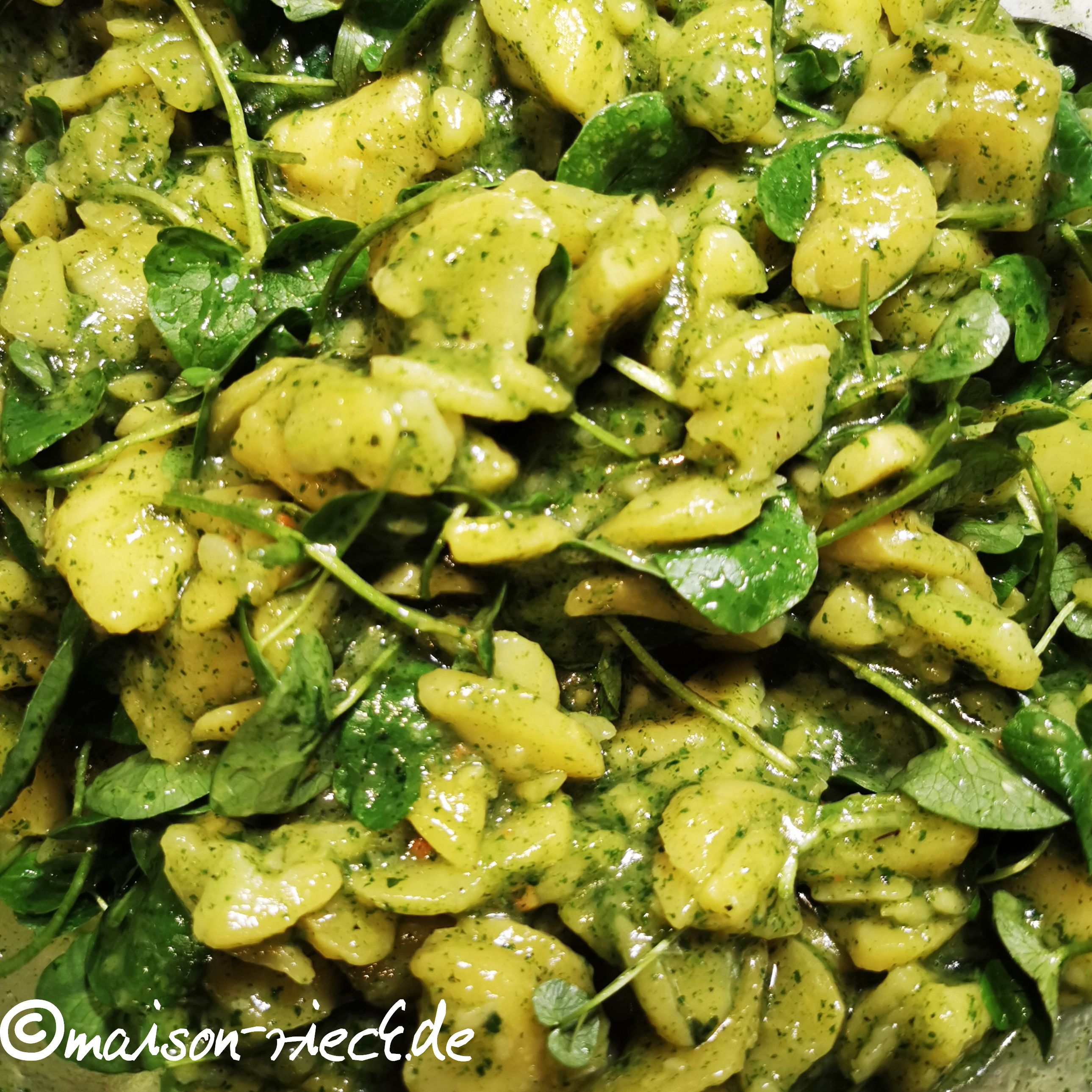 Diese Art eines grünen Kartoffelsalats lässt sich natürlich auch nur mit Brennnesseln oder mit anderen Wildkräutern zubereiten. Besonders gut eigenen sich Blätter von Bärlauch, Löwenzahn, Giersch, Vogelmiere, Behaartem Schaumkraut (wilder Kresse) und wilder Rauke.