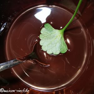 Die Kuvertüre im Wasserbad schmelzen lassen. Währenddessen die Gundermann-Blätter waschen und trocknen lassen.