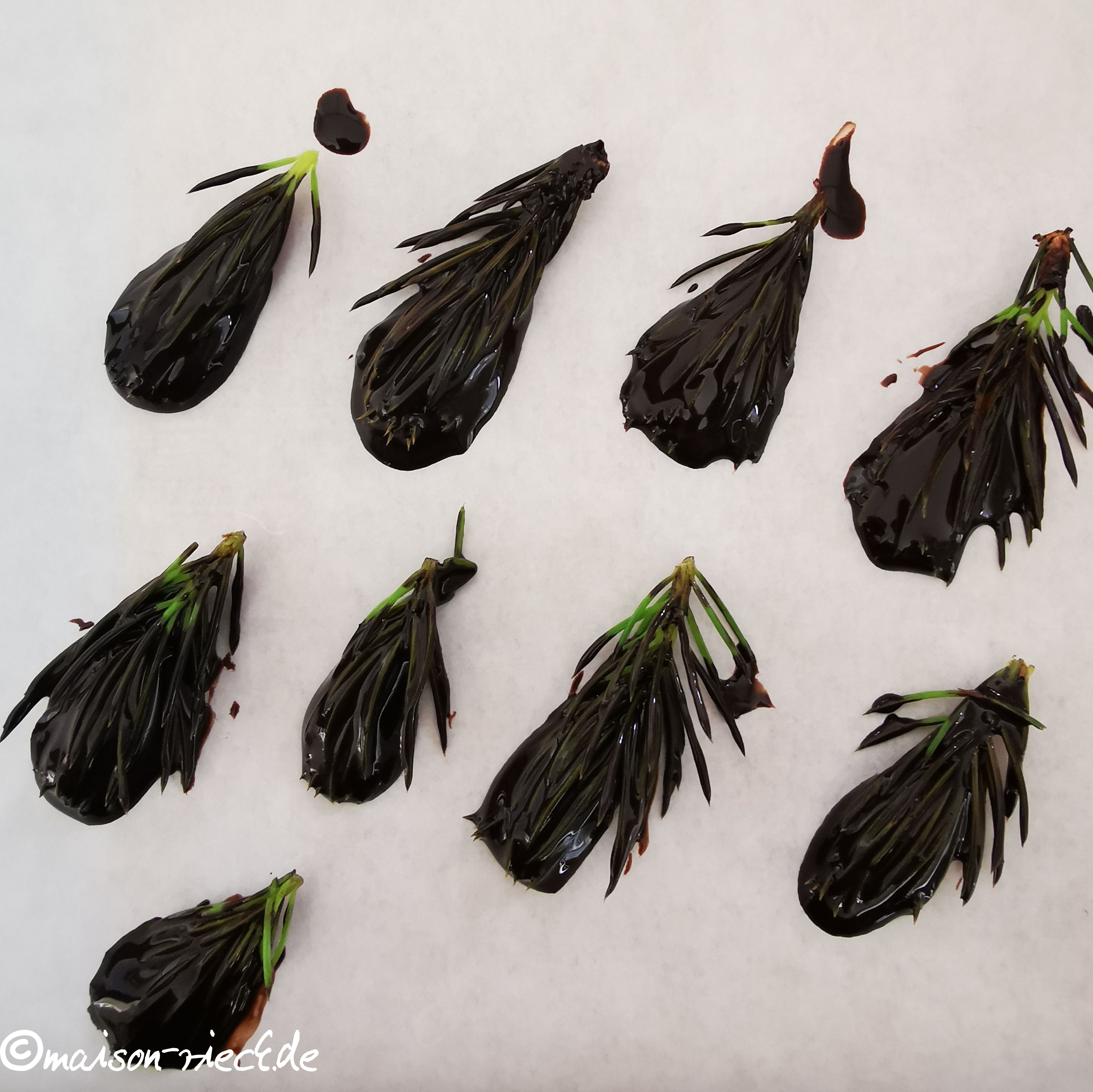 Mit den Fichtenspitzen ebenso verfahren. Wenn alle Konfekt-Stücke auf dem Butterbrotpapier platziert sind, das Brettchen für ca. eine halbe Stunde in den Kühlschrank stellen. Danach kann man die Konfekt-Stücke vorsichtig abnehmen und servieren. Sie lassen sich in einer gut verschlossenen Dose auch bis zu 5 Tage im Kühlschrank aufbewahren.