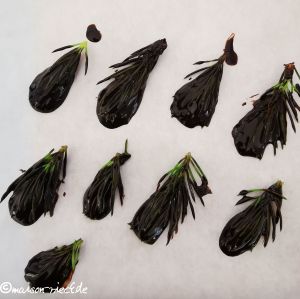 Die Blätter am Stiel anfassen, vorsichtig in die flüssige Schokolade tauchen. Dann abtropfen lassen und auf ein mit Butterbrotpapier ausgelegtes Brettchen legen. Nach Belieben noch mit einer Gundermann-Blüte verzieren.