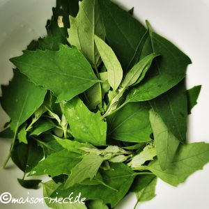 In der Zwischenzeit die Gänsefuß-Blätter von den Stängeln zupfen, waschen und abtropfen lassen.