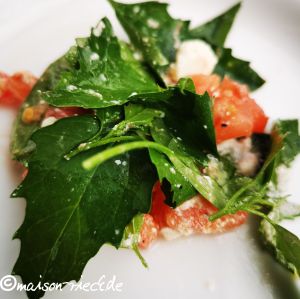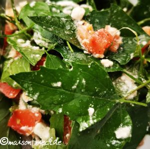 Anschließend die Gänsefuß-Blätter mit den Tomaten mischen. Den Feta mit den Fingern grob zerkrümeln und darüber geben.