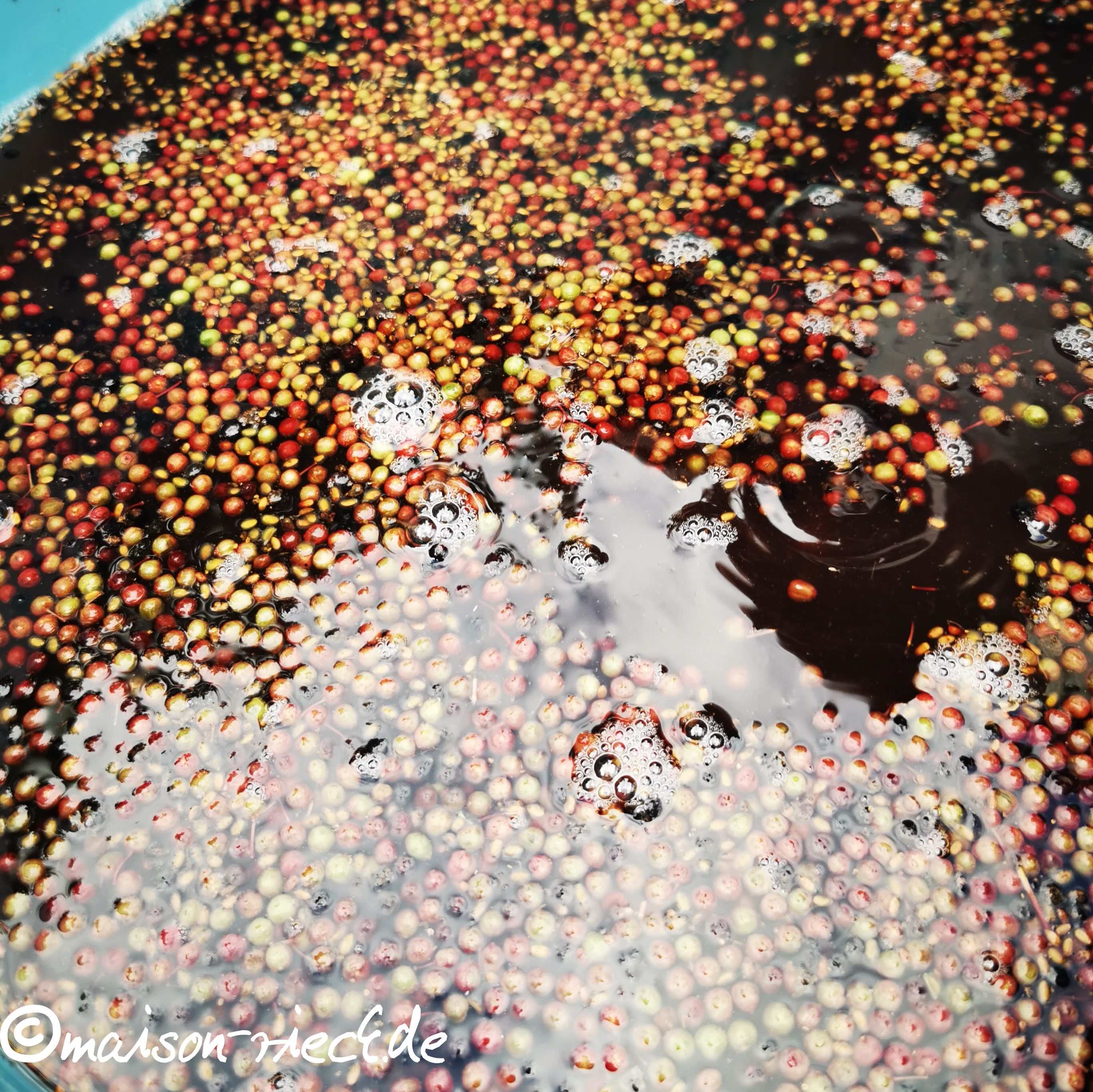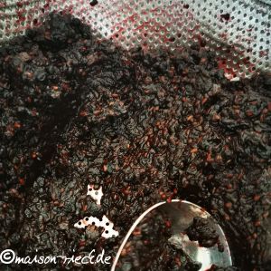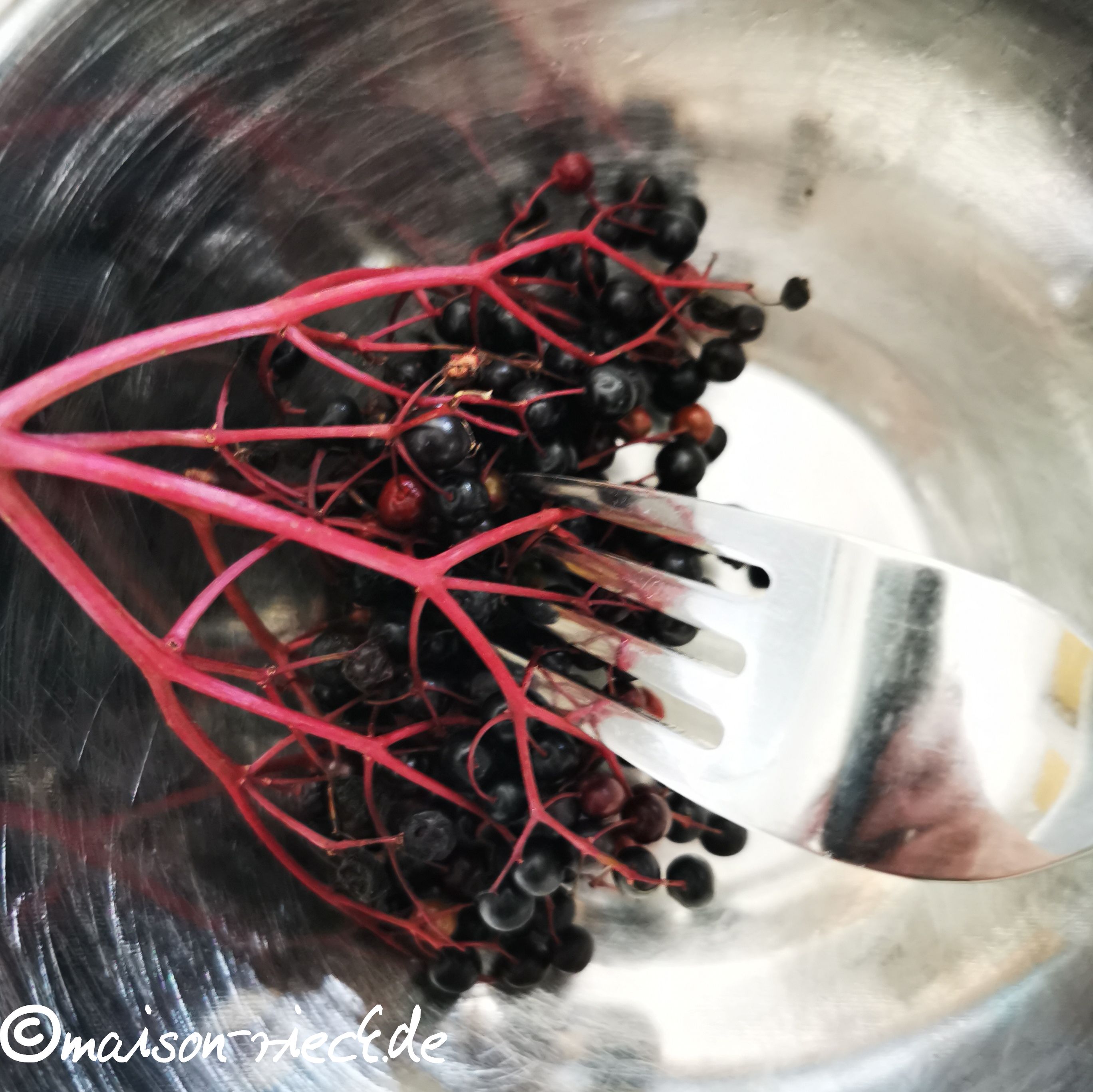 Die schwarzen Beeren werden in einem Topf knapp mit Wasser bedeckt aufgekocht und ca. 15 Minuten bei geringer Hitze gekocht, bis die Früchte alle aufgeplatzt sind. Nach dem Abkühlen werden die Früchte durch ein feines Sieb (oder eine Flotte Lotte) passiert. Alternativ bietet sich auch die Verwendung eines Dampfentsafters an.