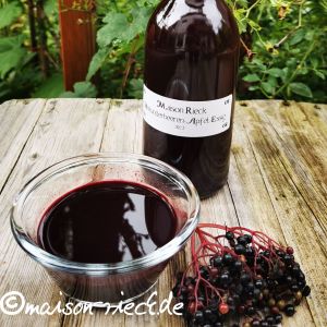 Tipp: Um den Holunderbeeren-Geschmack zu intensivieren, kann der Essig auch für eine Weile mit den Fruchtresten vom Entsaften zusammen in weithalsige Flaschen (z.B. Milchflaschen) gefüllt werden. Nach mehreren Wochen werden die Fruchtreste abgefiltert und der Holunderbeeren-Essig mit Honig oder Zucker gemischt und in kleinere Flaschen abgefüllt.