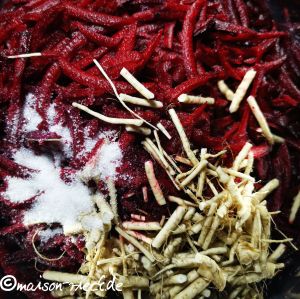 Die geschälten Rote Bete auf einer Reibe oder mit der Küchenmaschine grob reiben. Die Knoblauchrauke-Wurzel waschen und in kleine Stücke schneiden (falls Meerrettich verwendet wird, diesen ebenfalls reiben). In eine Schüssel geben und gut mit dem abgewogenen Salz mischen. (Achtung: die Roten Bete färben stark, der Meerrettich kann in der Nase und in den Augen brennen!)