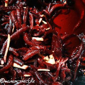 Am wenigsten bekannt ist heutzutage die Nutzung der Wurzeln der Knoblauchrauke. Es lohnt sich aber, sie als Alternative zu frischen Meerrettich auszuprobieren. Als Verwandte in der Familie der Kreuzblütengewächse haben sie unter anderem scharfe Senfölgykoside gemeinsam, bei der Knoblauchrauke vor allem das Sinigrin. Diese Schärfe kommt in der Kombination mit Rote Bete sehr gut zur Geltung.