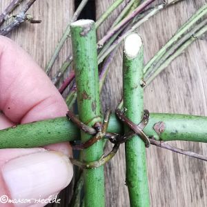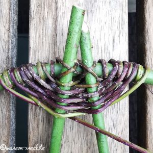 Besonders interessant sind aber die langen Ranken der Kratzbeeren. Sie sind gleichmäßig dünn, flexibel, reißfest und haben eine rötliche Färbung, die durch eine leichte Bereifung noch interessanter wird. Sie eigenen sich, genau wie Brombeer-Ranken, ideal als Flechtmaterial. Man kann sie zum Beispiel mit der Schwingentechnik ähnlich verarbeiten wie im Beitrag Korb aus Brombee-Ranken beschrieben. Da die Ranken allerdings viele kleine Dornen haben, werden sie am besten mit einer Gartenschere und Lederhandschuhen geerntet. Anschließend werden die Dornen und Blätter mit den Lederhandschuhen abgestreift, was bei den Kratzbeeren noch einfacher geht als bei den Brombeeren.