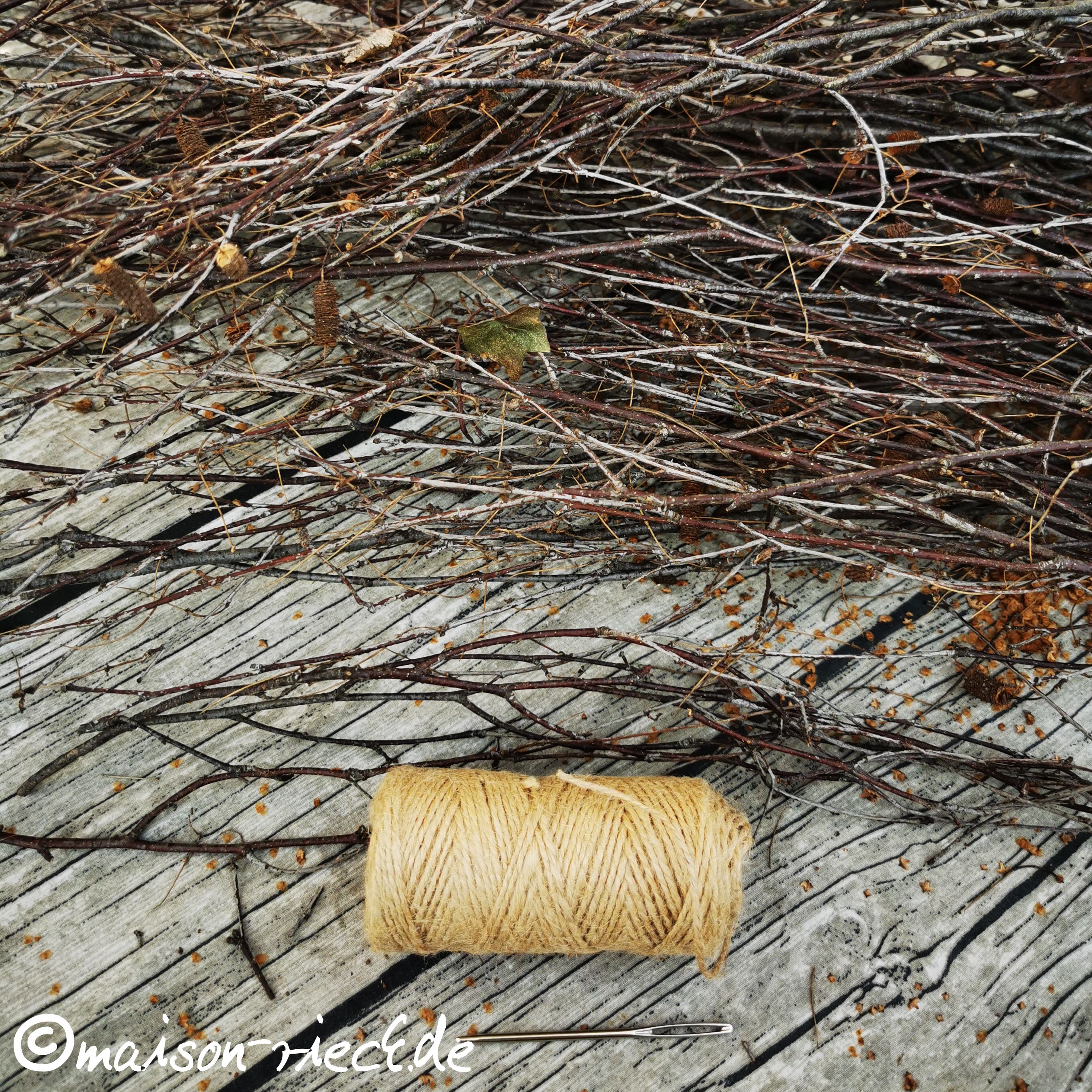 Außer dem Birkenreisig ist nur ein stabiles Garn oder eine dünne Schnur, idealerweise aus Naturmaterial (z.B. Leinen, Brennnessel, Sisal oder Jute) und eine Nadel nötig.