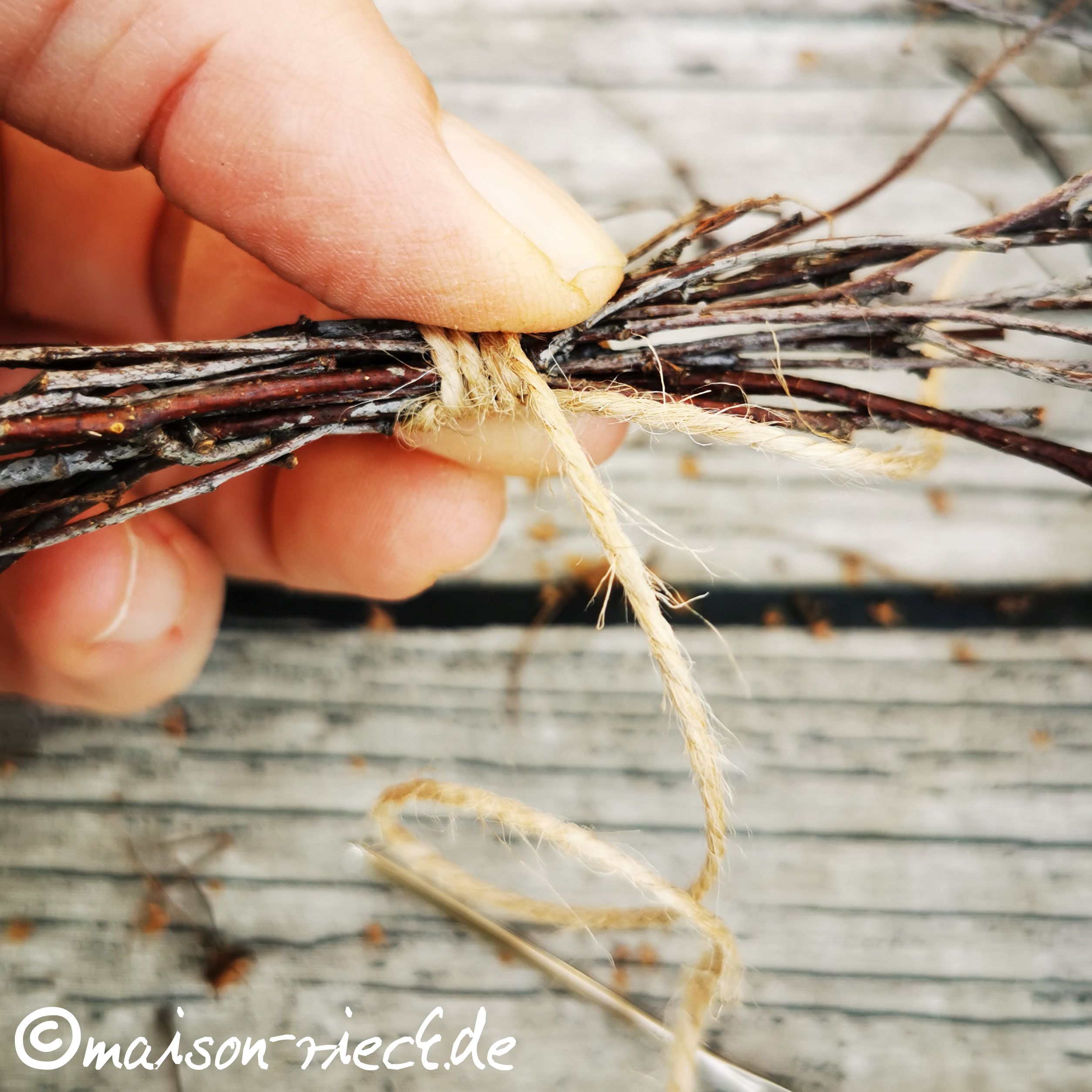 Für den Anfang sucht man sich ein kleines Bündel aus besonders dünnen Reisern zusammen und bindet es am dünnen Ende mit dem Garn fest zusammen. Ein Ende des Garn sollte dabei ca. 80 cm lang sein. Das lange Ende des Garns so oft fest um das kleine Bündel wickeln, bis ca. 6 cm umwickelt sind.