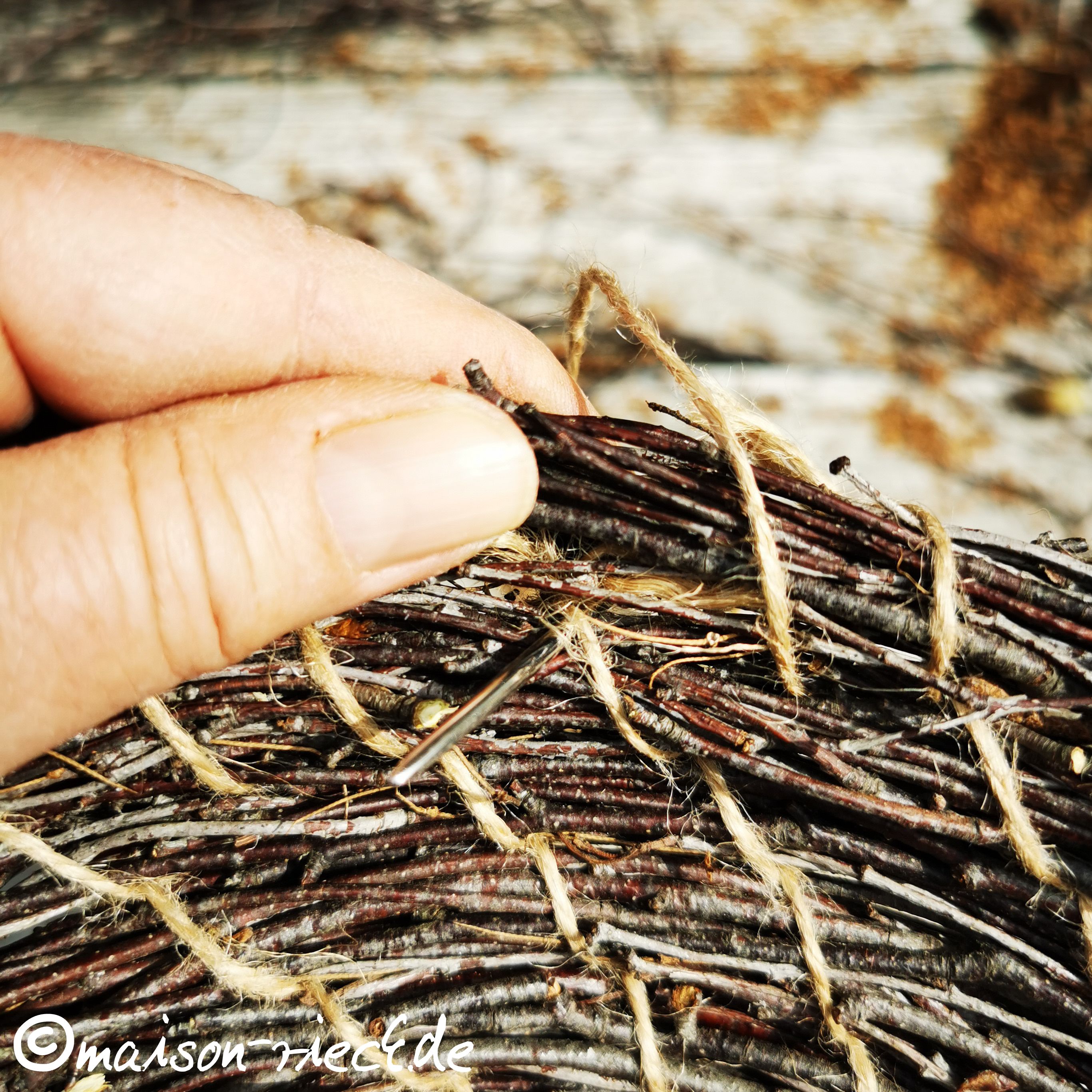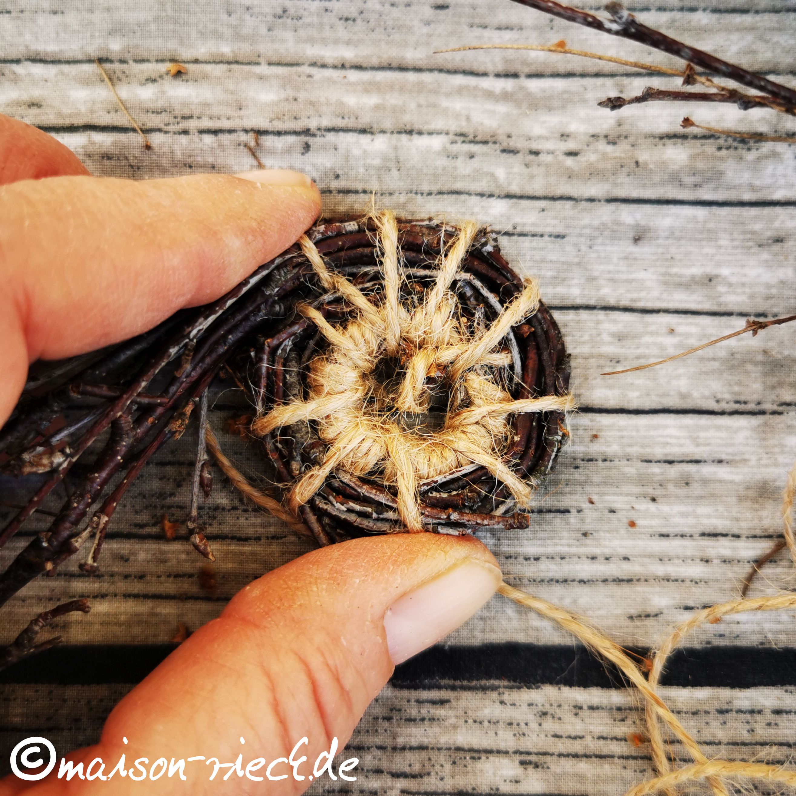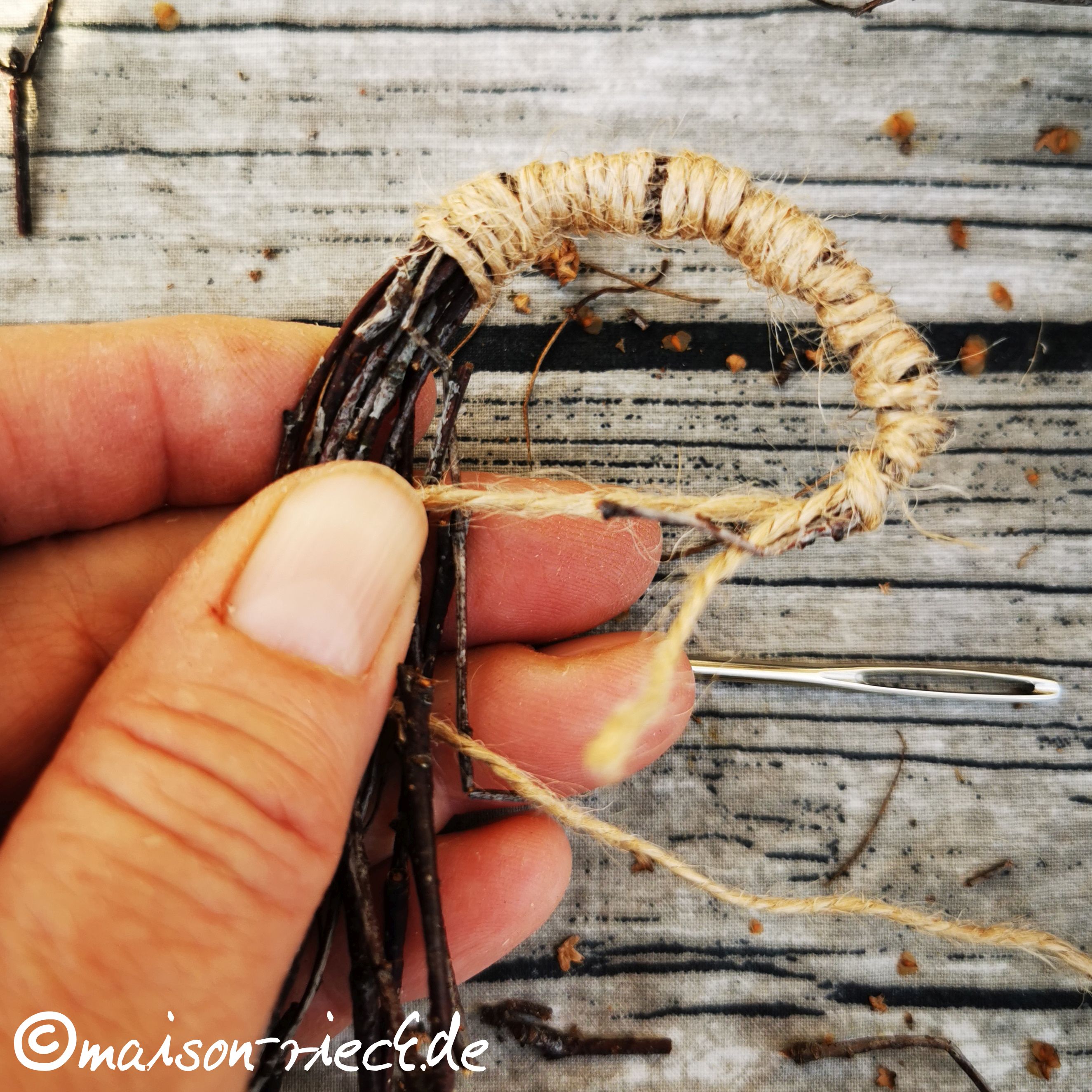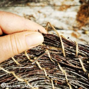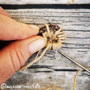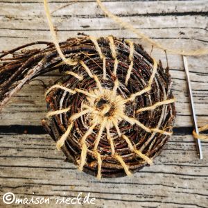 Das Garn mit Hilfe der Nadel mehrmals durch das entstandene Loch ziehen, das Reisigbündel dabei gegen den Uhrzeigersinn um den kleinen Kreis herum legen und mit dem Faden fixieren.