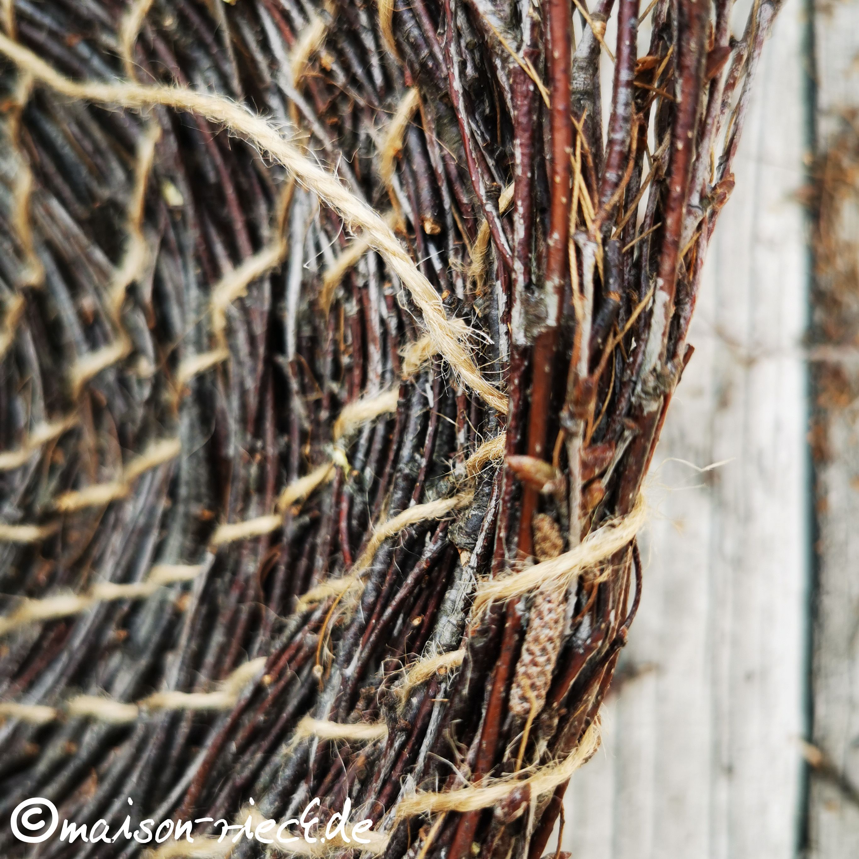Spätestens am Ende der ersten Runde neue Reiser in das vorhandene Bündel einlegen (ab jetzt mit dem dickeren Ende voran und möglichst in der Mittel der noch vorhandenen), so dass dieses kontinuierlich verlängert wird und an Stärke zunimmt.