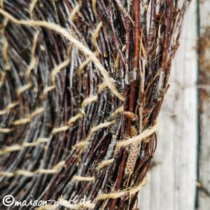 Wenn die gewünschte Höhe erreicht ist, das Reisigbündel nicht mehr durch neue Reiser verlängern, sondern auslaufen lassen. Das Garn am Schluss verknoten und die noch überstehenden Enden der Stellen, an denen das Garn verlängert wurde, vorsichtig abschneiden.