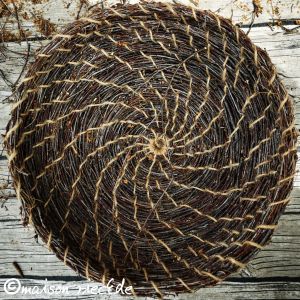 Wenn der Boden des Korbes den gewünschten Durchmesser erreicht hat (ca. 20 cm), wird der Rand nach oben gearbeitet. Dafür wird in den folgenden Runden das Reisigbündel leicht nach oben/innen versetzt angelegt und festgewickelt.