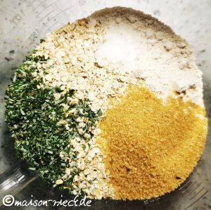 Die Haferflocken zusammen mit dem Hafermehl, dem braunen Zucker, dem Salz und den fein gehackten Douglasien-Nadeln in eine Schüssel geben und vermischen.