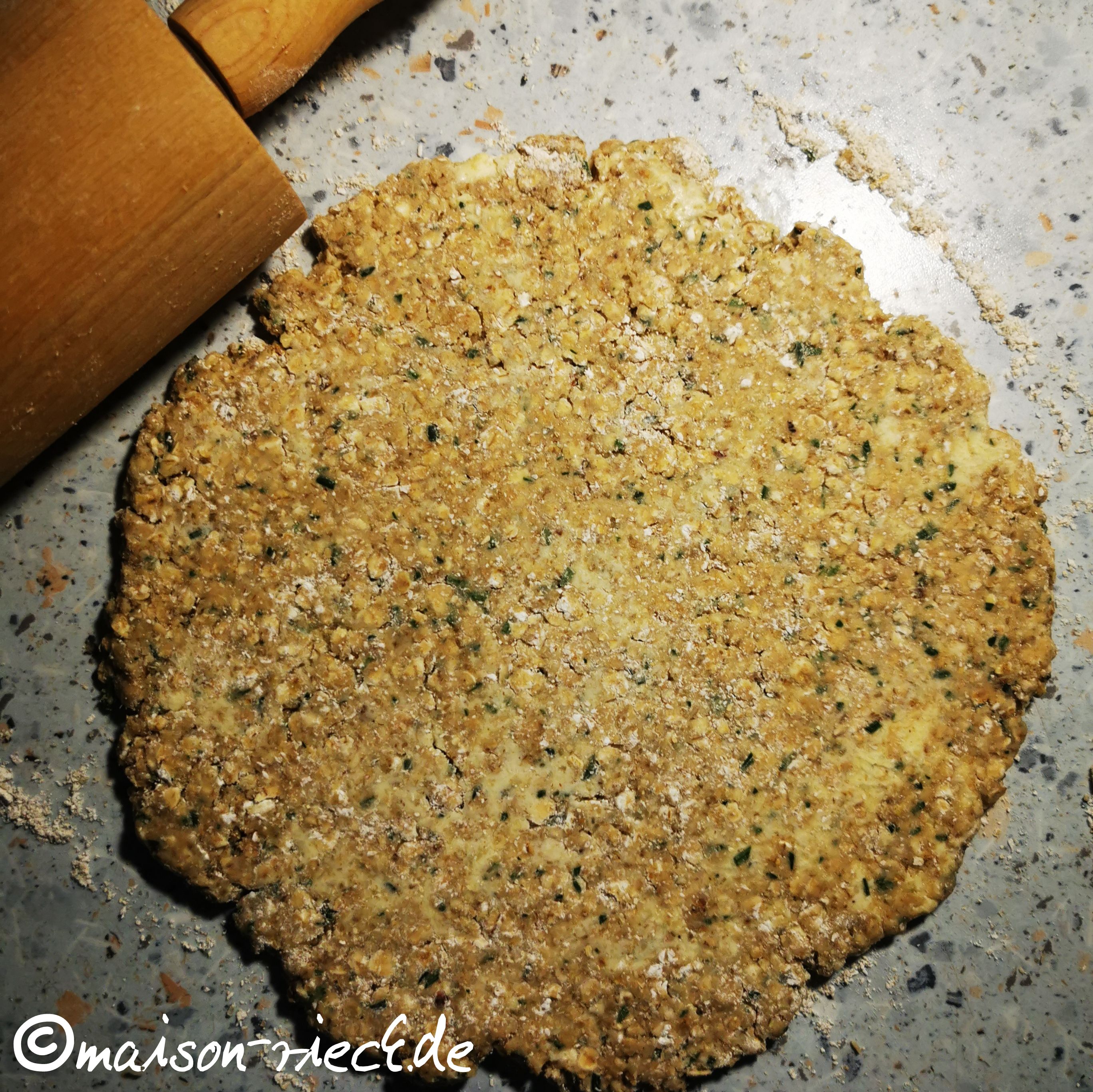 Die Mischung zuerst mit einem Kochlöffel verrühren, bis sie anfängt, sich zu verbinden. Dann die verbliebenen Butterstücke mit den Fingern verreiben und den Teig zu einer Kugel formen, die so gerade zusammenhält. Der Teig sollte nicht zu stark geknetet werden. Falls er zu trocken ist, noch etwas Milch oder Wasser dazugeben; ist er zu feucht, noch etwas Hafermehl dazugeben.