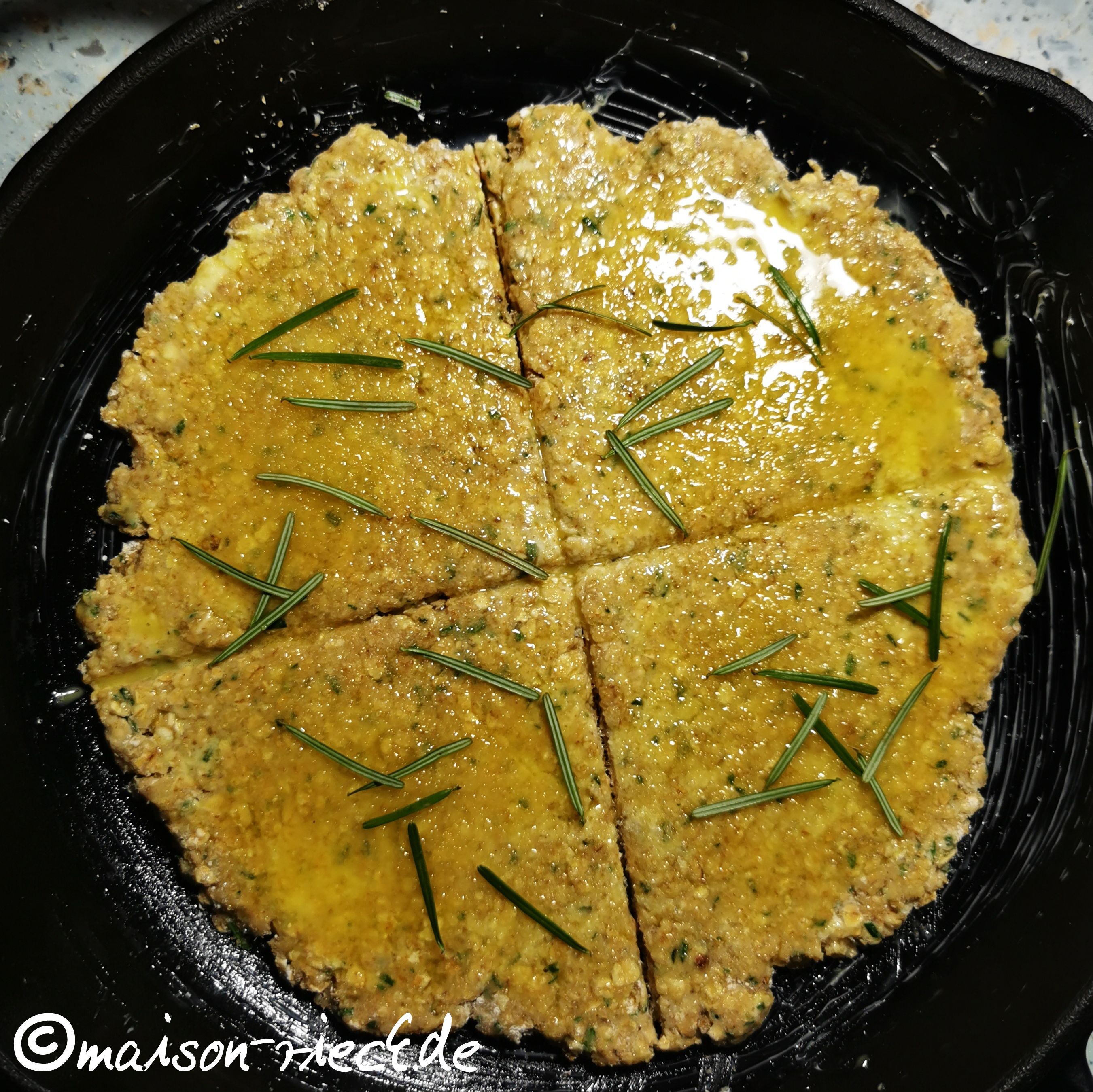 Den Haferfladen in der Pfanne in 4 oder 8 Teile schneiden. Das Eigelb mit 2 EL Wasser verquirlen und die beiden Fladenbrote damit bestreichen. Anschließend auf dem flüssigen Eigelb den weißen Zucker verteilen und nach Belieben noch ein paar Douglasien- oder Rosmarin-Nadeln darüber streuen.