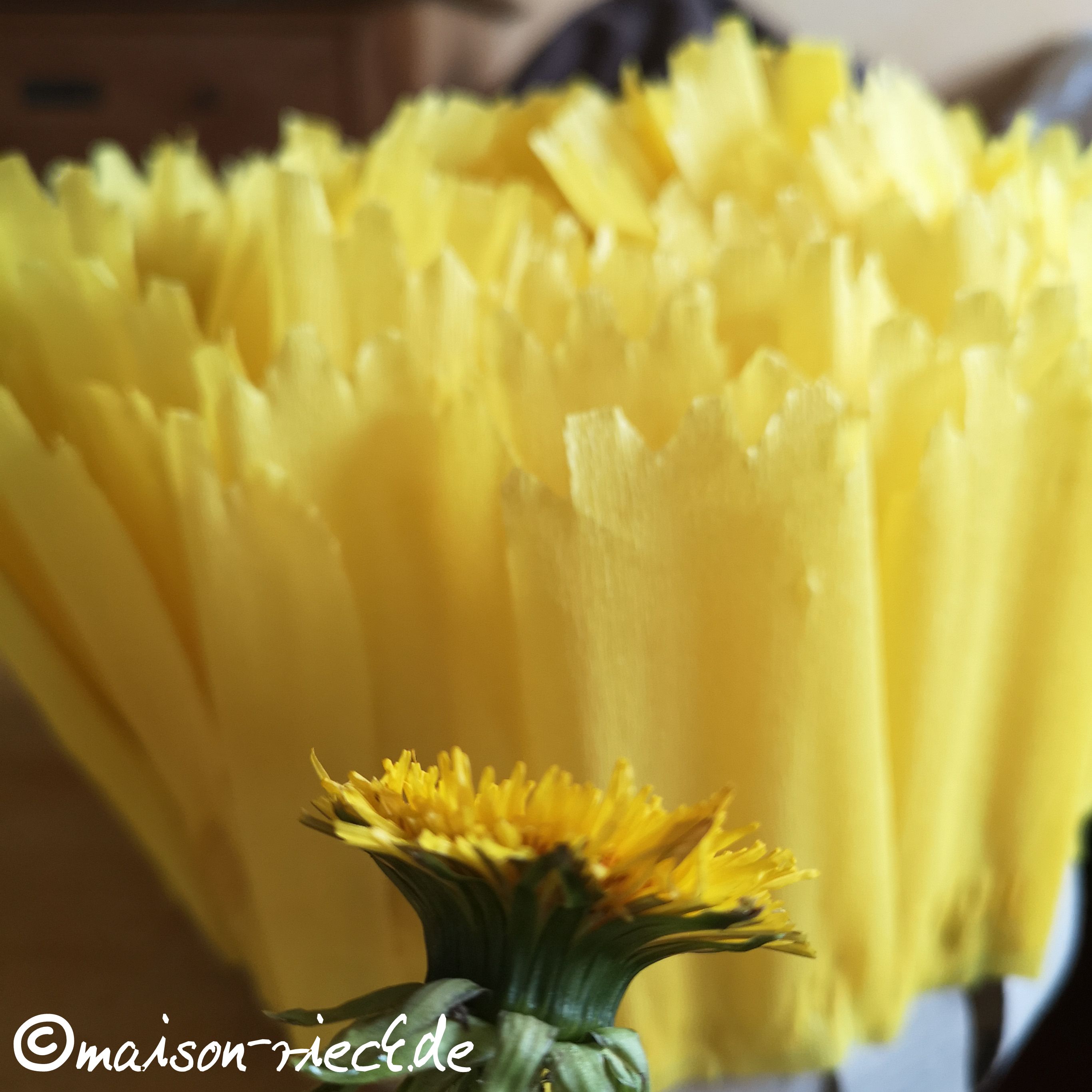Aus löwenzahngelbem Krepp-Papier werden dann längs ca. 4-5 cm breite Steifen geschnitten.