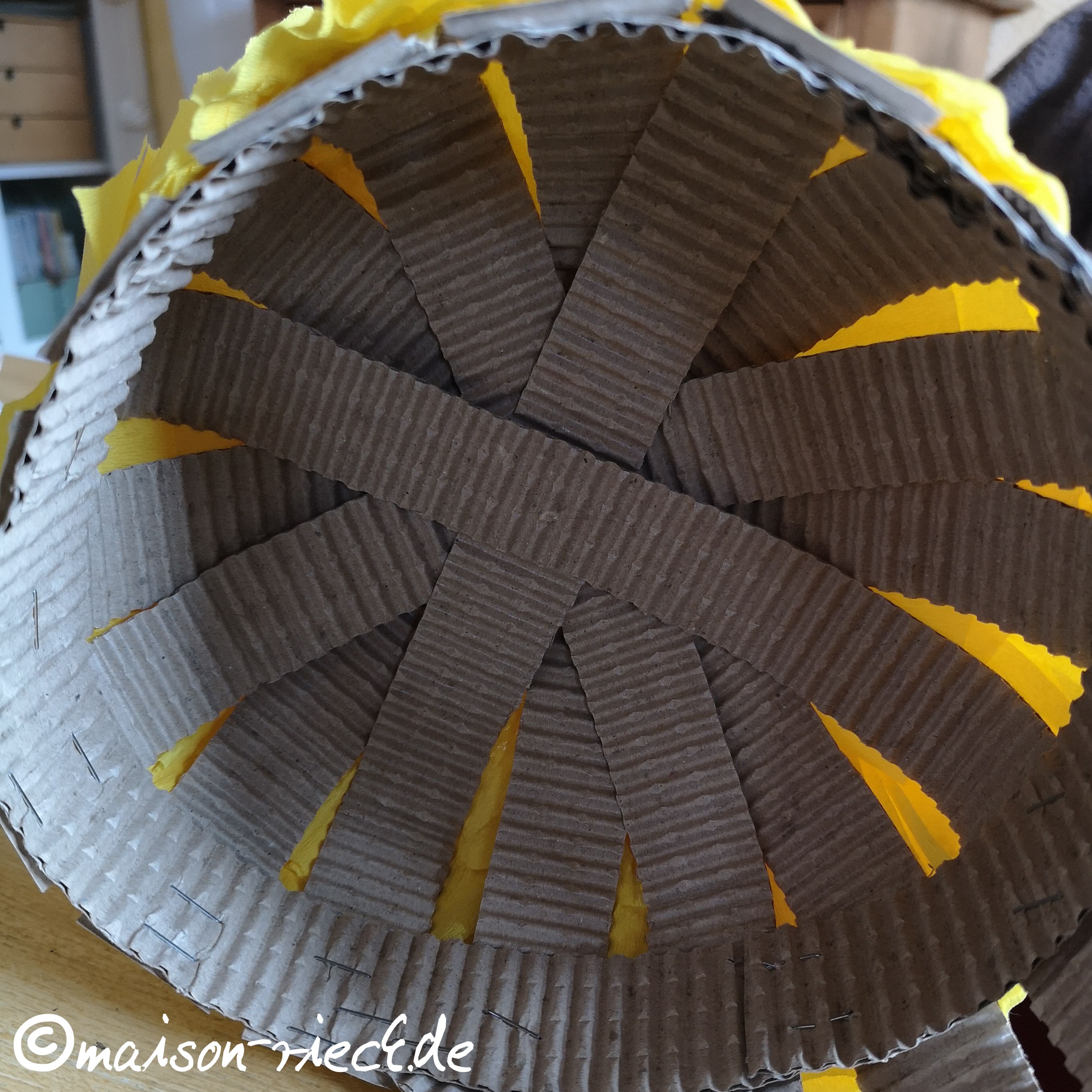 Um eine solche Blüte auf dem Kopf tragen zu können, wird eine Art Hut oder Helm benötigt, auf dem die Zungenblüten befestigt werden können. Dieser lässt sich ganz einfach z.B. aus Pappe herstellen.