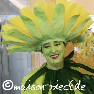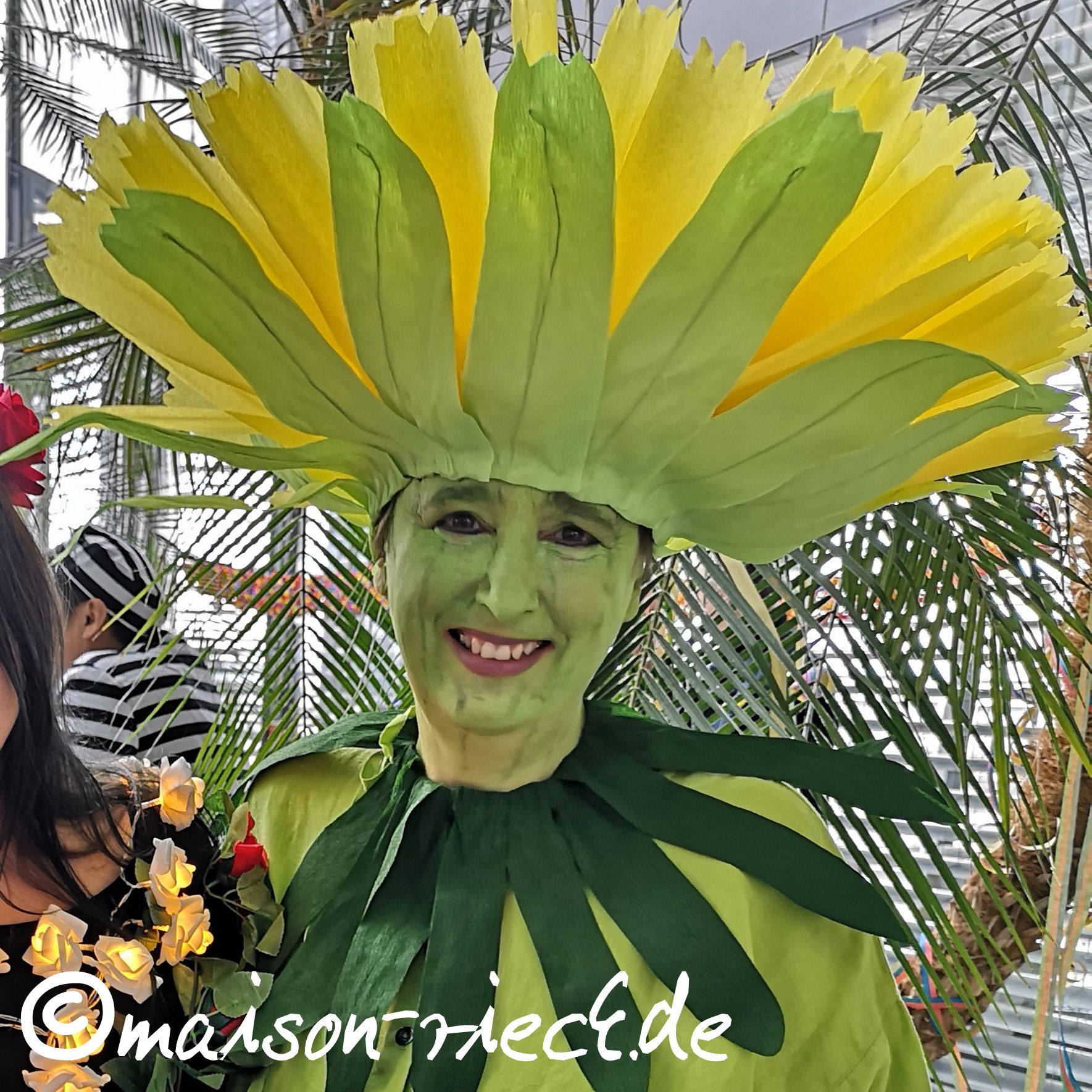 Den unteren Teil des Blütenkörbchen bildet das Gesicht, das deshalb möglichst im gleichen Grünton geschminkt wird, wie die Farbe der äußeren Blütenblätter. Ein grünes, langes Gewand ist der Stiel der Pflanze, auf dem noch ein großes Löwenzahn-Blatt aus dunkelgrünem Filz angebracht werden kann.